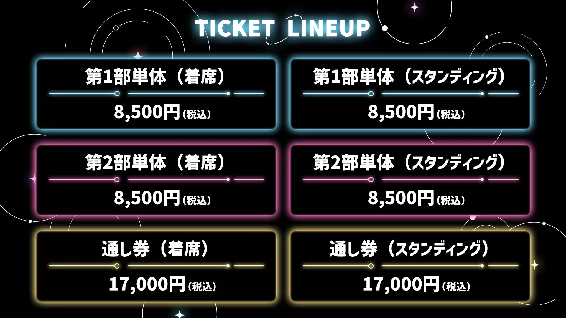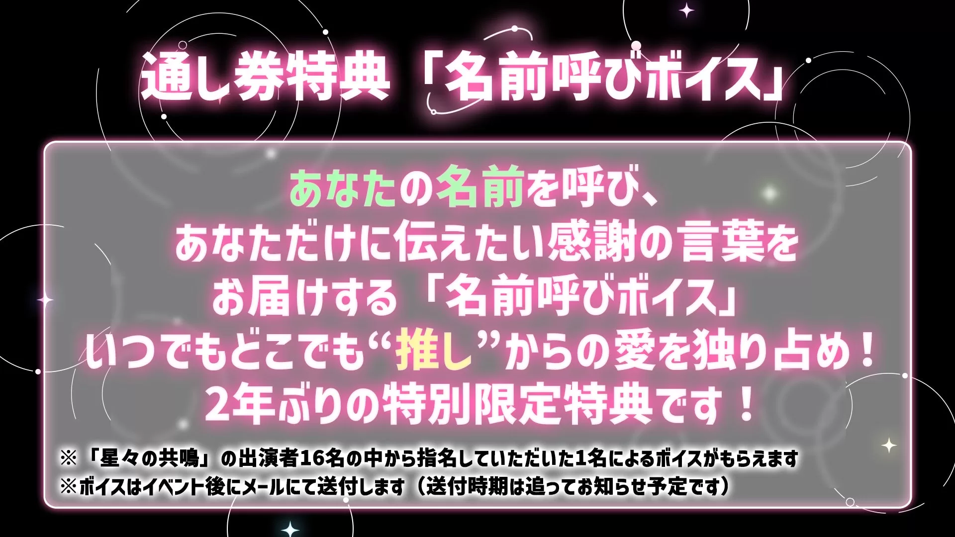 1月11日の『星々の共鳴』は各部着席・スタンディング8,500円、通し券17,000円。通し券特典はタレントごとの「名前呼びボイス」。