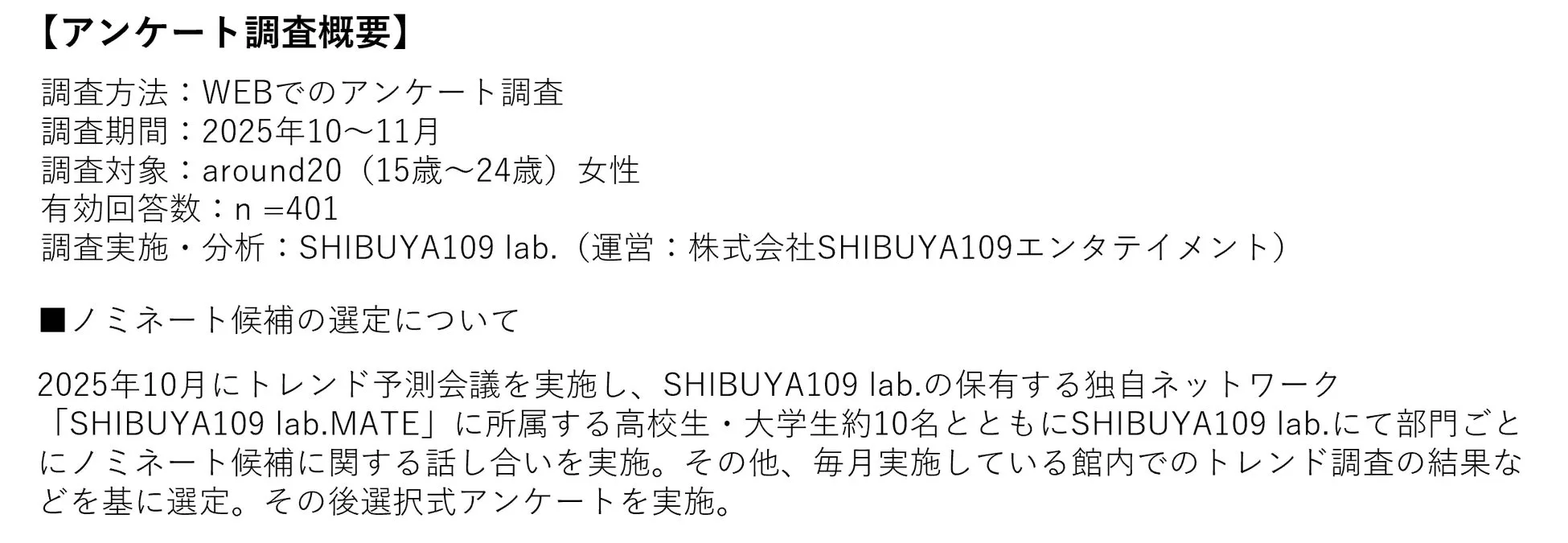 株式会社SHIBUYA109エンタテイメント(本社:東京都渋谷区、社長:石川あゆみ)が運営する若者マーケティング研究機関『SHIBUYA109 lab.(読み:シブヤイチマルキュウラボ)』は、SHIBUYA109 lab.が保有する独自ネットワーク「SHIBUYA109 lab. MATE」に所属する、around20(15~24歳)の女性401名を対象に実施した2026年のトレンド予測の結果をお知らせいたします。