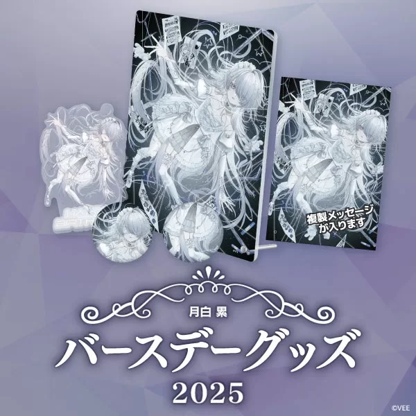 2025年の月白 累のバースデーグッズは、描き下ろしイラストを使用した「アクリルパネル」と「アクリルスタンド」と「缶バッジ」が登場!