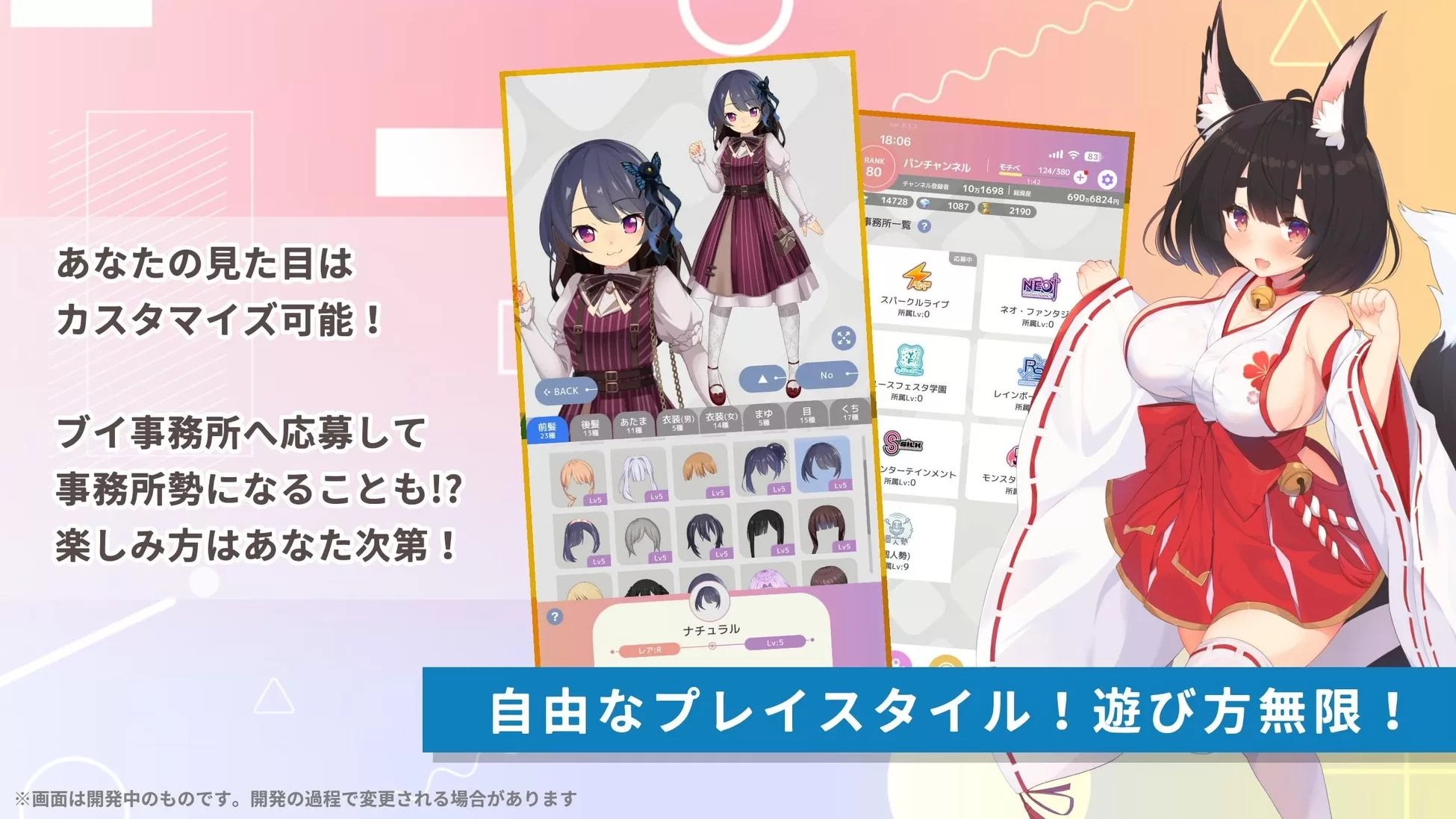 人気V活動者の妹失踪をめぐるストーリーも展開され、V業界の光と影を描く。また、声優、イラストレーター、UIデザイナーら豪華クリエイターが参加し、個性豊かなVキャラクター(自称巫女系V、方向音痴な蝶守護者Vなど)とコラボやバトルを楽しめる。
