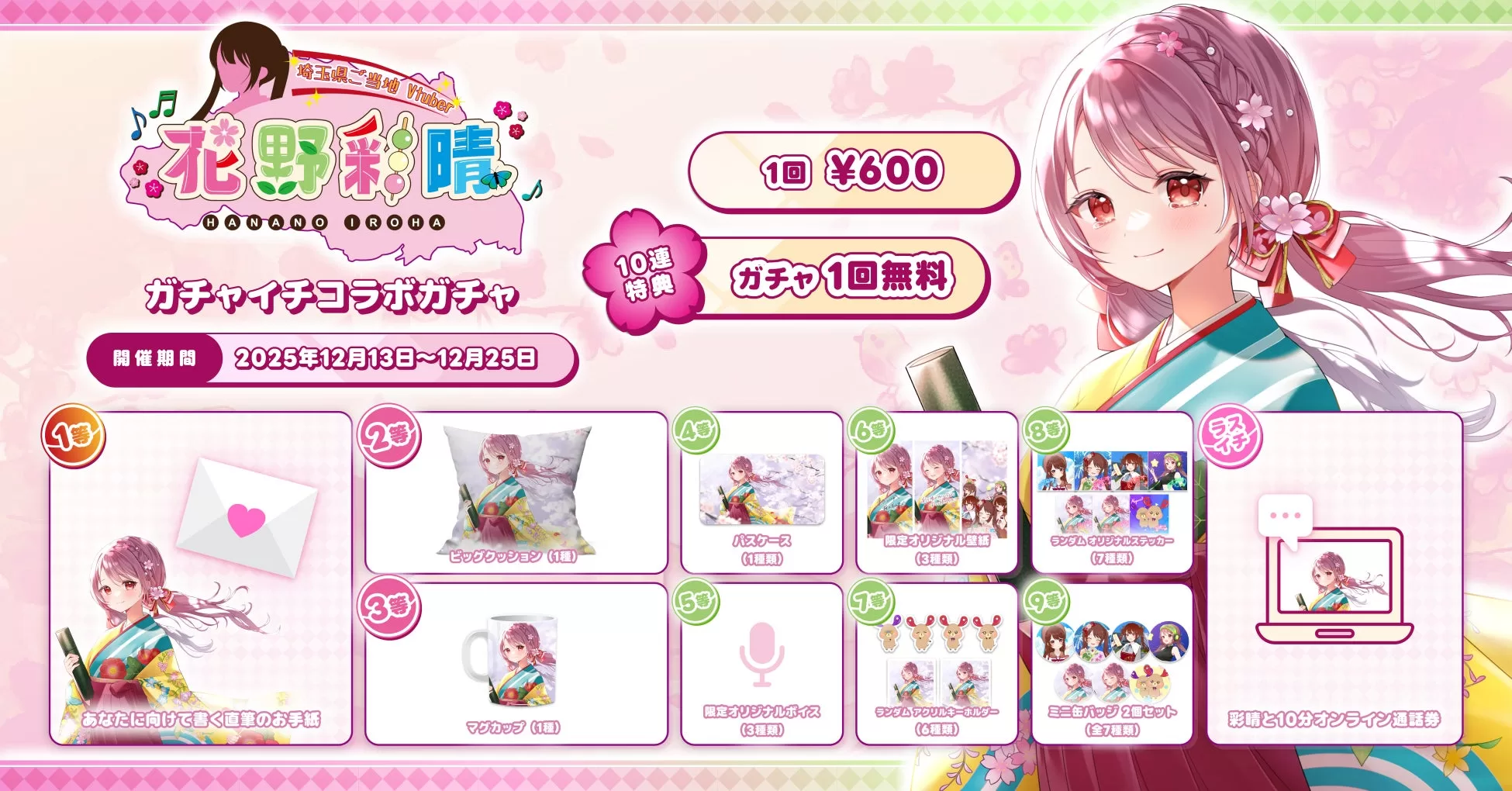 本イベントは、埼玉を拠点とする両者のコラボレーションで、東京・大阪へ展開する狙いがあるとのこと。景品は本コラボ限定グッズ全9種類で、10分オンライン通話券、あなたに向けて書く直筆のお手紙、ビッグクッション、マグカップ、パスケース、限定オリジナルボイス、限定オリジナル壁紙、ランダムアクリルキーホルダー、ランダムオリジナルステッカー、ミニ缶バッジ2個セットがラインナップされる。