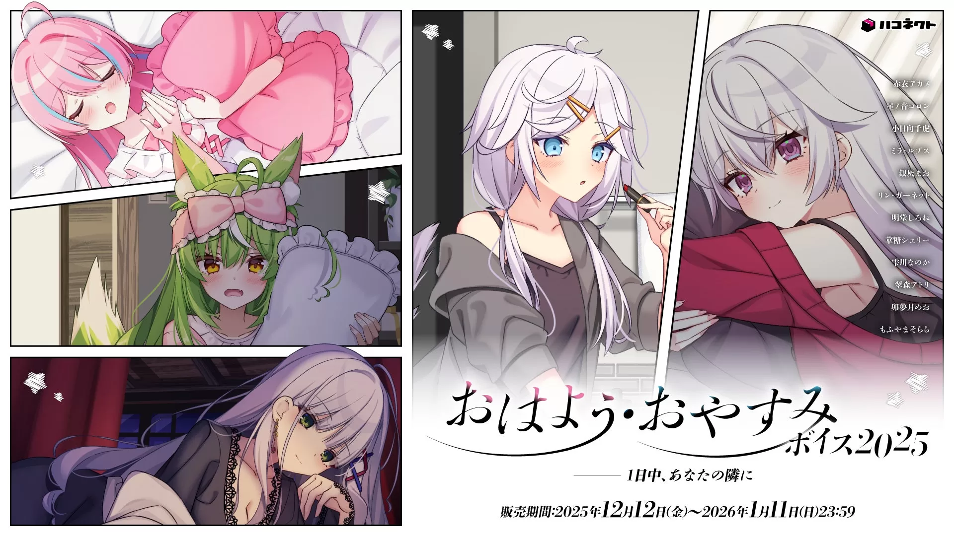 VTuber事務所ハコネクトは、所属メンバーが参加するボイスコンテンツ『ハコネクトおはよう・おやすみボイス2025』をハコネクト公式BOOTHにて販売開始すると発表した。販売期間は2025年12月12日(金)19時00分から2026年1月11日(日)23時59分までで、おはよう・おやすみをコンセプトにした内容とのこと。