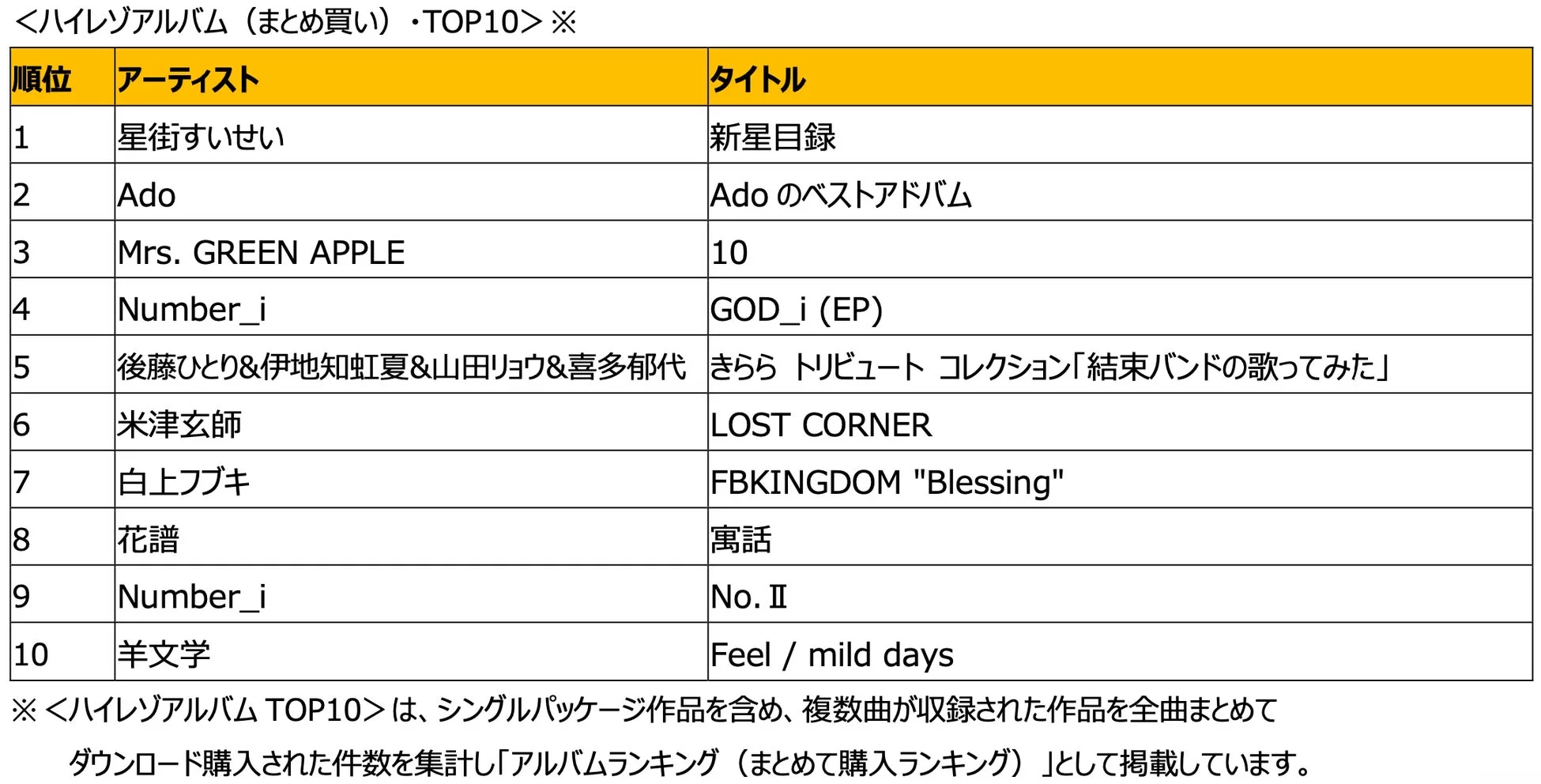 ●総合アルバム(まとめ買い)部門では、3位にMrs. GREEN APPLEのデビュー10周年記念ベストアルバム「10」がランクイン。そのほか、Adoの初ベストアルバム、サザンオールスターズ10年ぶりのオリジナルアルバムなどがランクインし、今年の音楽シーンを彩っています。
