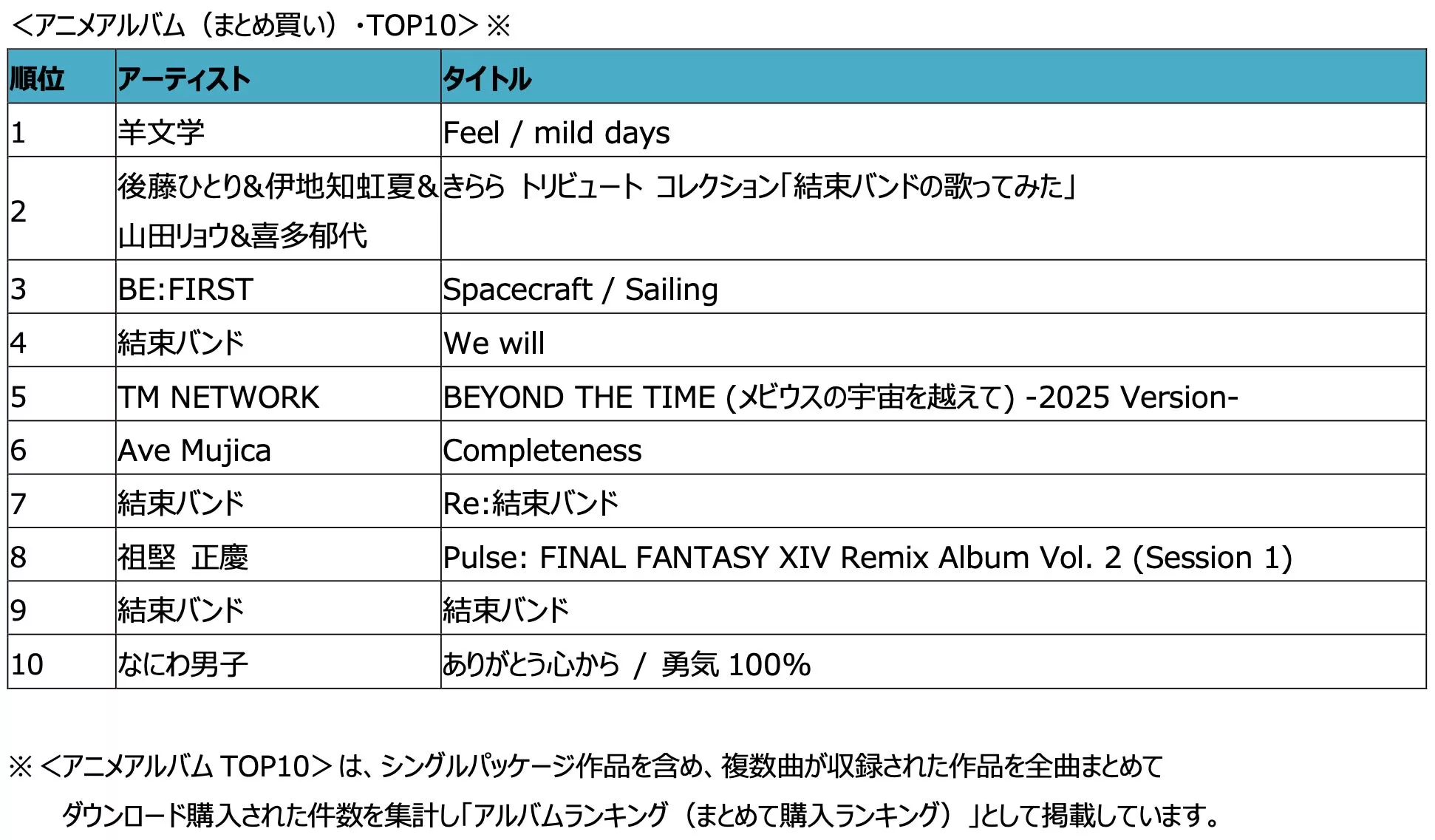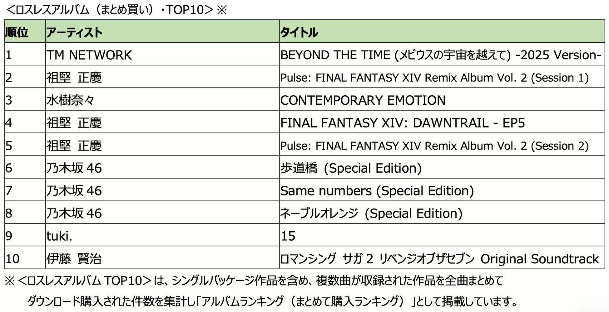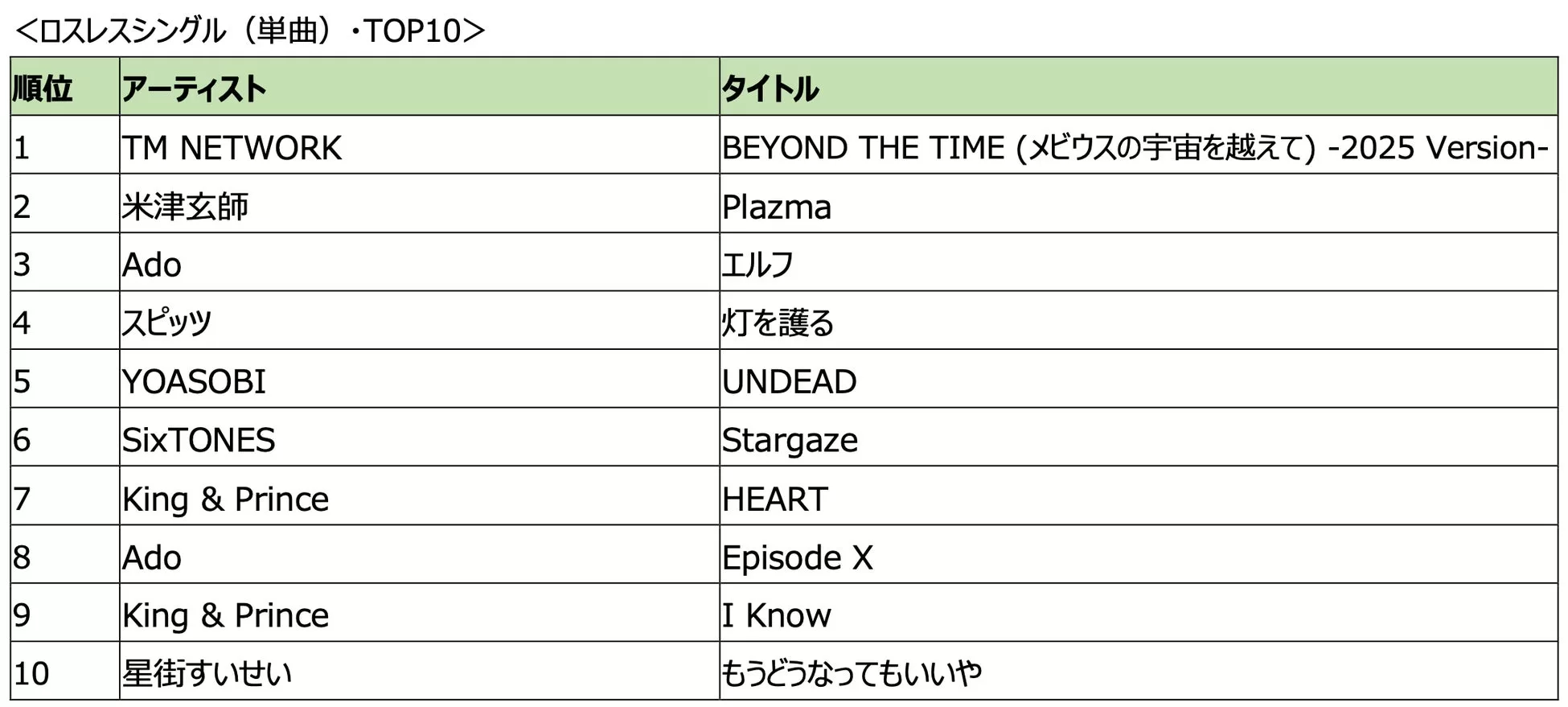 ロスレス部門ではTM NETWORK「BEYOND THE TIME (メビウスの宇宙を越えて) -2025 Version-」がシングル・アルバム両部門1位。アニメシングル部門も米津玄師がトップ3独占するなど、アニメ関連楽曲が上位を賑わせた。