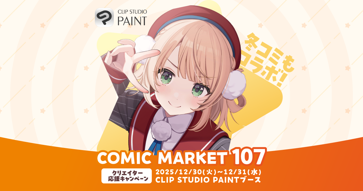 セルシスは、12月30日(火)から31日(水)に東京ビッグサイトで開催される「コミックマーケット107」に出展します。ブースでは、「C107限定クリエイター応援キャンペーン」として各種創作ツールをコミケ限定特価で販売するほか、CLIP STUDIO PAINTの公式アンバサダーであるイラストレーターのしぐれうい先生との第2弾コラボパッケージ「CLIP STUDIO PAINT PRO 1デバイスプラン12ヶ月版 」も販売します。