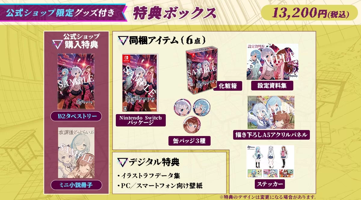 『崩課後どっとライブ -黄昏ノ鏡-』特典ボックス(税込み13,200円)は、アニメイト、あみあみ、ゲーマーズ、ヨドバシカメラにて予約を受け付けます。詳細は各販売店の公式サイトをご確認ください。