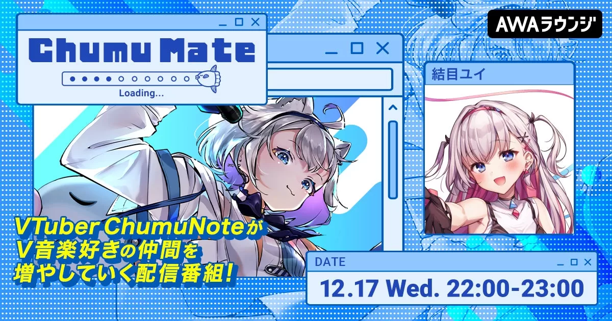 AWA株式会社(本社:東京都港区、代表取締役CEO:冨樫晃己)が運営する、サブスクリプション型(定額制)音楽ストリーミングサービス「AWA(アワ)」は、2025年12月17日22:00~23:00の1時間に渡り、無料で誰でも参加できるオンライン空間「ラウンジ」で、VTuberのChumuNoteがゲストアーティストと共に楽曲を深掘りし、V音楽好きの仲間を増やしていく音楽番組『ChumuMate』の第16回を開催いたします。