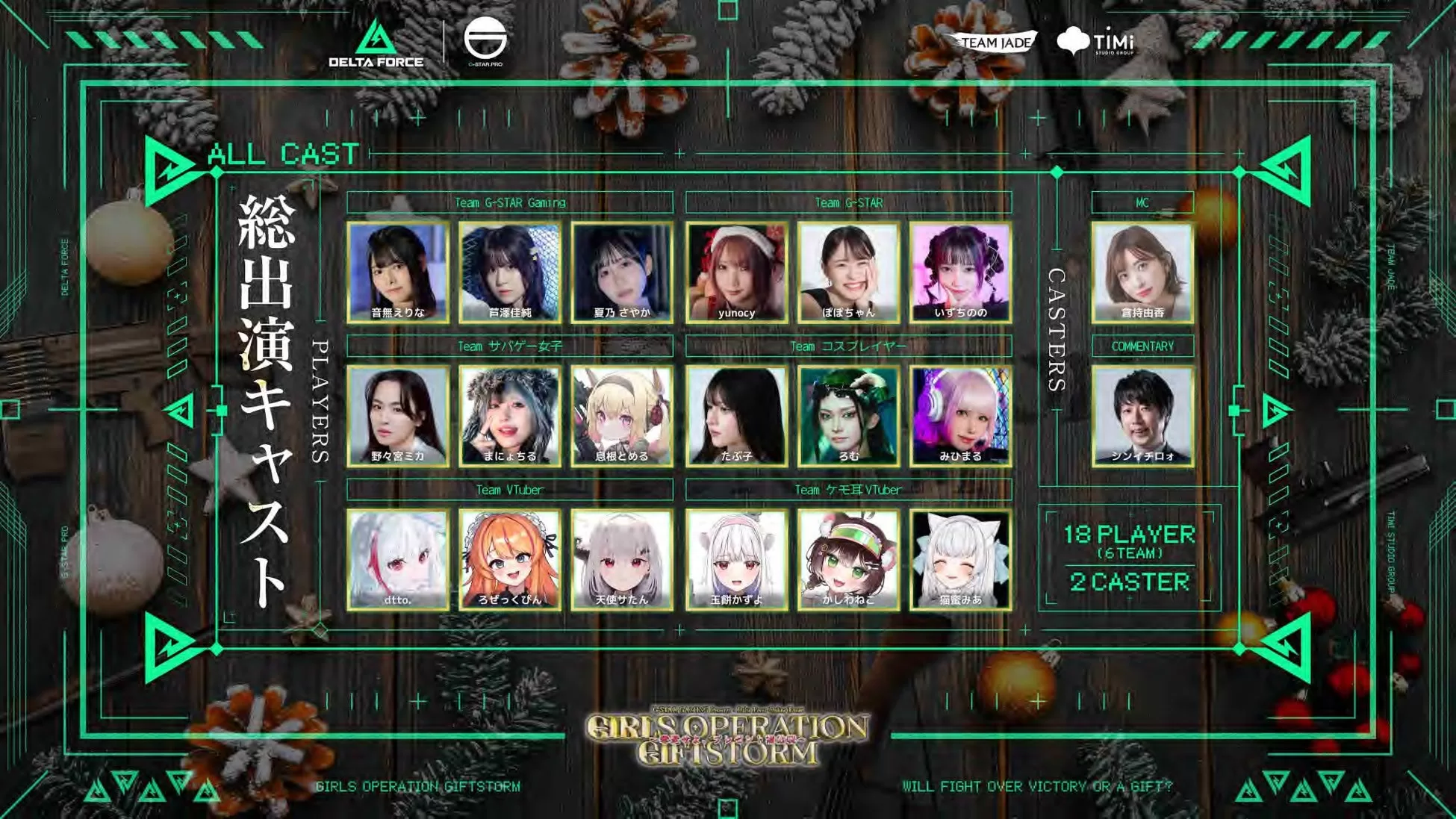 さらに、12月21日19:00から株式会社G-STAR.PRO主催の女性プレイヤー大会『GIRLS OPERATION GIFTSTORM』を開催予定。ストリーマー、コスプレイヤー、サバゲー女子、VTuberら18名が参加し、チームバトルと視聴者プレゼント戦を実施。配信はG-STAR Gaming YouTubeチャンネル で。