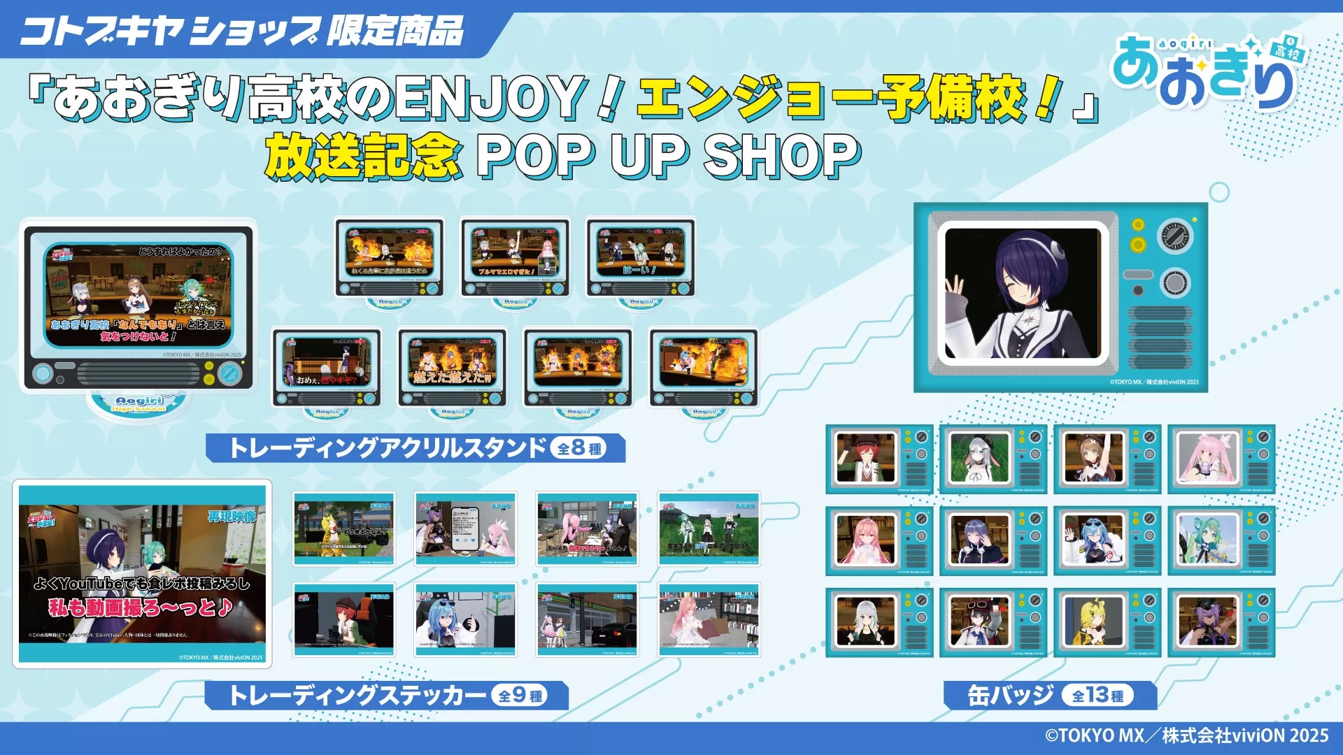会場では、【あおぎり高校のENJOY!エンジョー予備校!】と冠したトレーディングアクリルスタンド、トレーディングステッカーに加え、メンバー13名全員の缶バッジといった番組内オリジナルグッズを販売予定です。さらに、POP UP SHOPならではの企画として、秋葉原館4階のエスカレーター横の垂れ幕が番組仕様に装飾されるほか、メンバー13名による「店内ナレーション」、店頭ビジョン放送も実施し、ファンの皆様をお迎えします。