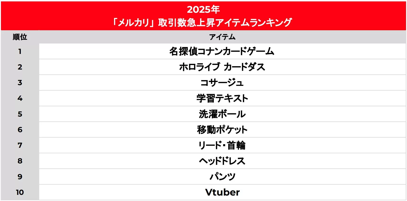 2024年と比べて、2025年に「メルカリ」の取引数が急上昇したアイテムは、1位・2位を「トレーディングカード」が占める結果となりました。「名探偵コナン」や人気VTuberを擁する「ホロライブ」などの人気が、その取引の活況からうかがえます。