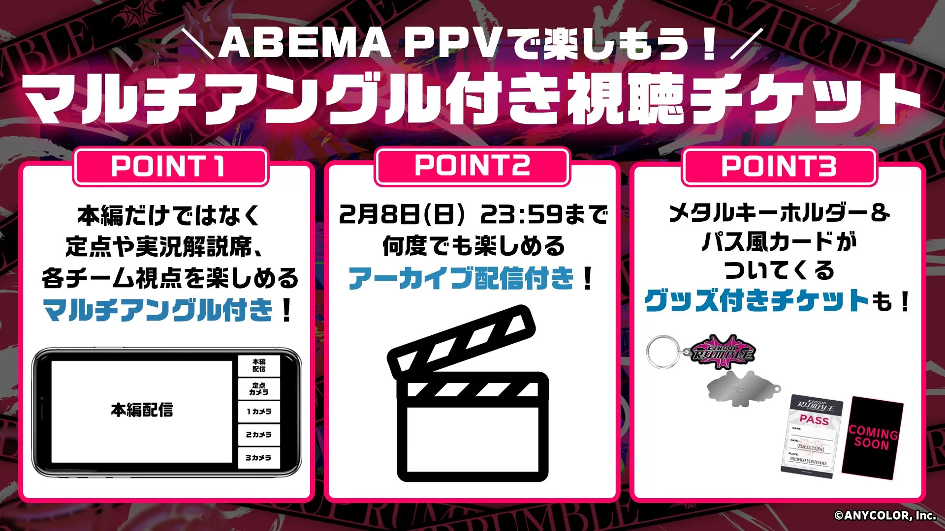 また、決勝戦/エキシビションマッチはABEMA(アベマ)にて全編無料配信を実施します。加えて、マルチアングル付き視聴チケット(有料チケット)でもアーカイブ配信やマルチアングルの視点をお楽しみいただけます。