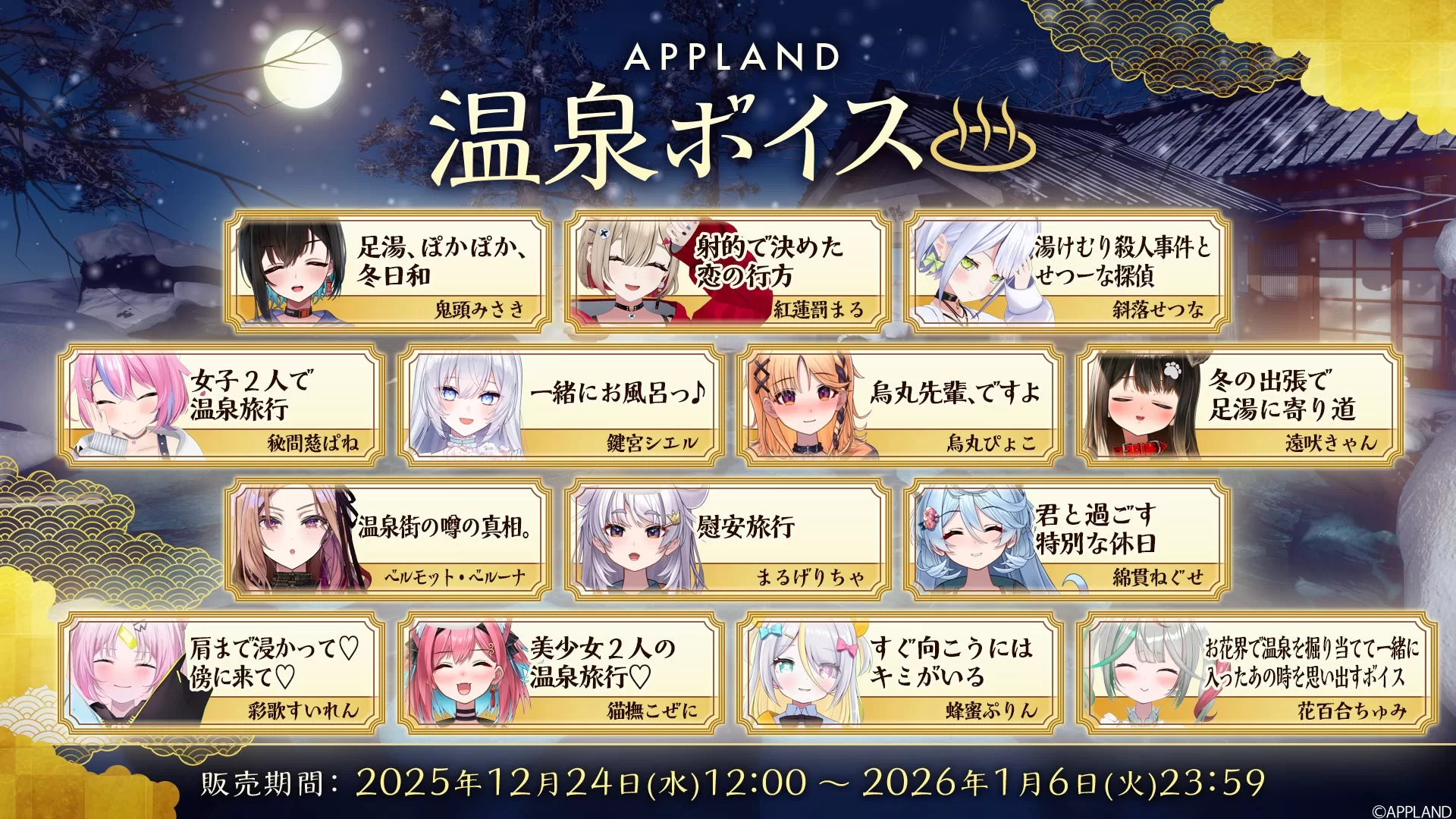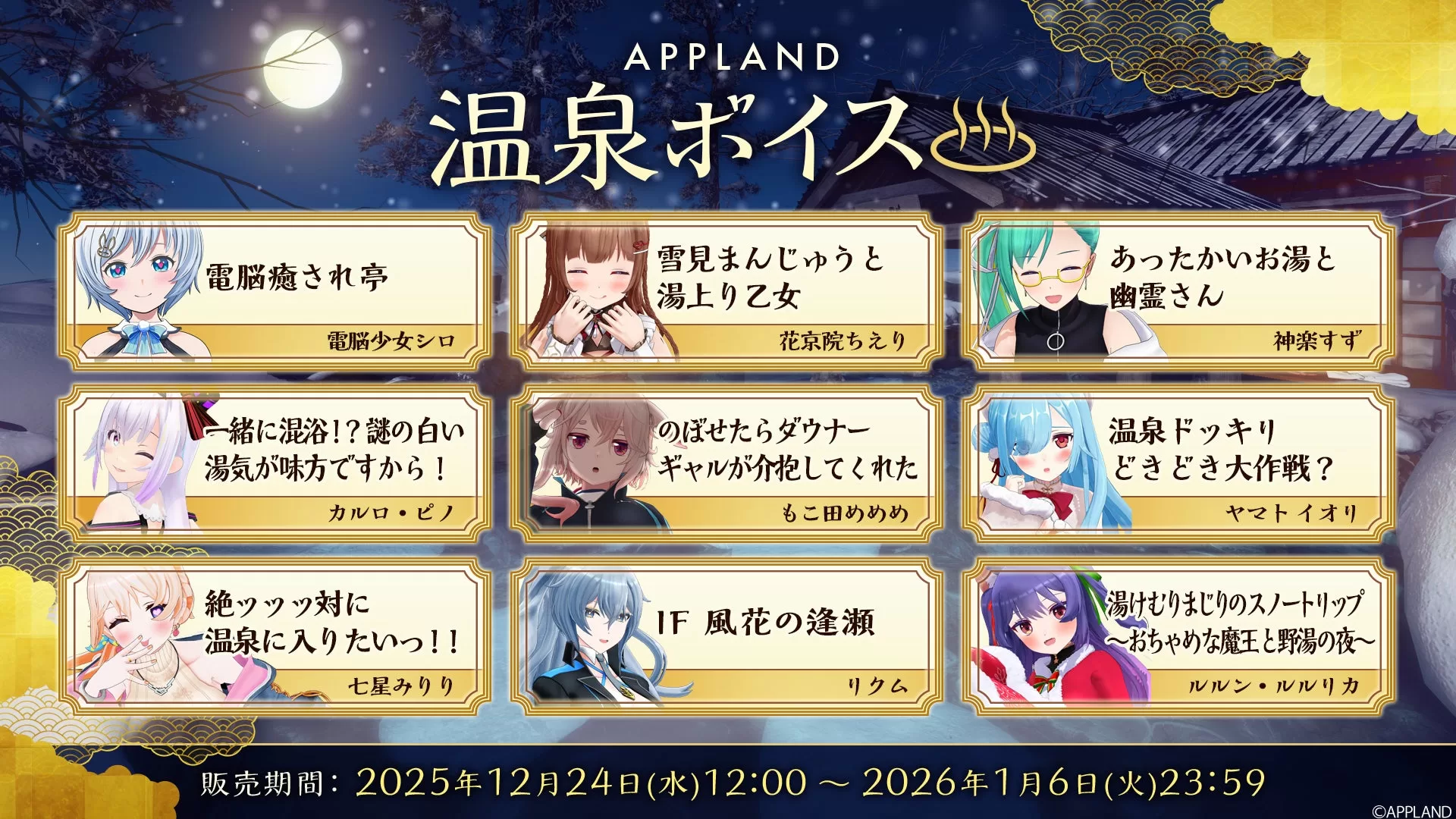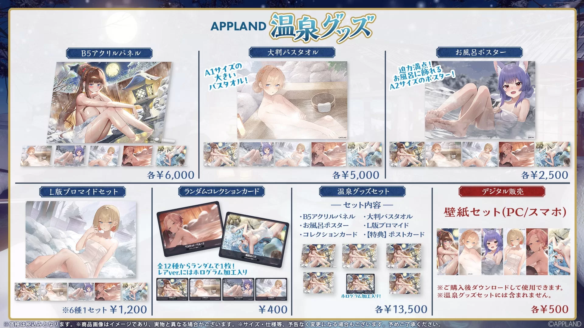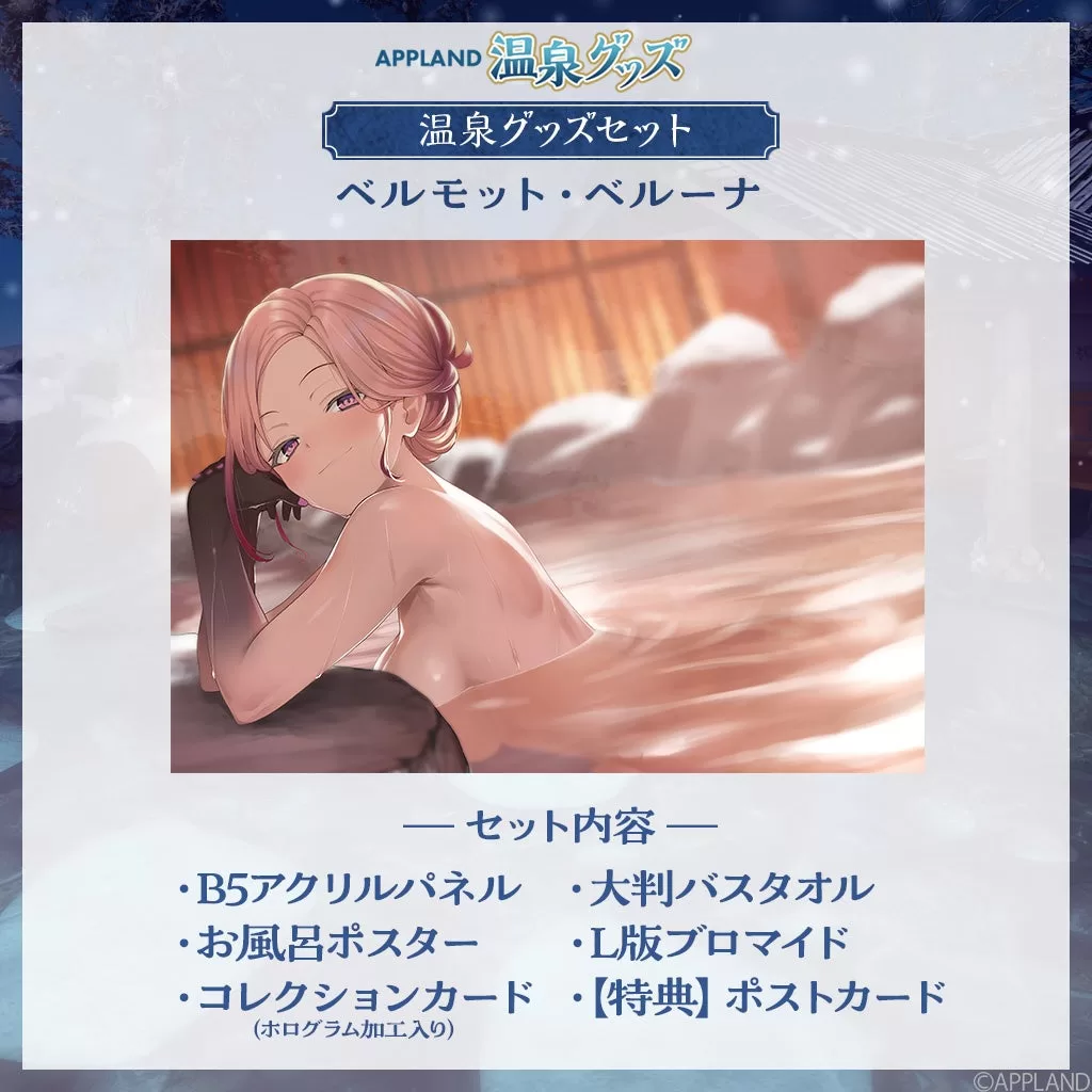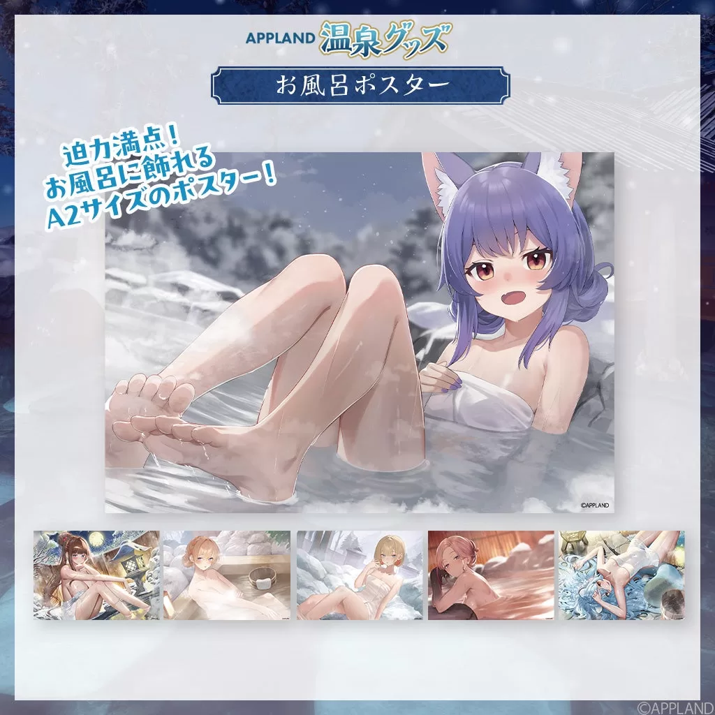 温泉グッズセット(全6種、13,500円税込) B5アクリルパネル(全6種、6,000円税込) 大判バスタオル(全6種、5,000円税込) お風呂ポスター(全6種、2,500円税込) L版ブロマイドセット(1,200円税込) ランダムコレクションカード(全12種、400円税込) 壁紙セット(PC/スマホ、全6種、500円税込) 『APPLAND温泉ボイス』は「.LIVE」と「ぶいぱい」メンバー合計23名が参加。「聴く温泉」をテーマにしたシチュエーションボイスで、各1,000円税込、フルコンプリートセット23,000円税込など。電脳少女シロの「電脳癒され亭」、花京院ちえりの「雪見まんじゅうと湯上り乙女」など個別テーマが用意されている。