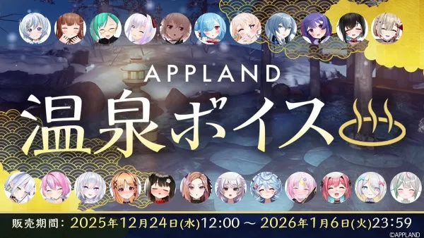 株式会社アップランド(本社:東京都世田谷区、以下「当社」)が運営する「.LIVE」・「ぶいぱい」メンバー合計6名の『APPLAND温泉グッズ』、および合計23名が参加する『APPLAND温泉ボイス』をAPPLAND OFFICIAL SHOPにて販売することをお知らせします。 「.LIVE」より花京院ちえり、七星みりり、ルルン・ルルリカ、「ぶいぱい」より紅蓮罰まる、ベルモット・ベルーナ、綿貫ねぐせの描き下ろしイラストを使用した『APPLAND温泉グッズ』を当社が運営する公式グッズ販売サイト(APPLAND OFFICIAL SHOP)にて2025年12月24日(水)より販売いたします。