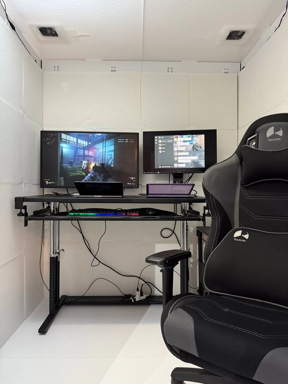 防音室の課題である「熱のこもり」を解消するため、天井に4つの換気ファンを標準装備。常に新鮮な外気を取り込み、PCの排熱などで温まった室内の空気を効率よく排出します。夏場や長時間のプレイでも、温度上昇を抑えて快適に過ごすことが可能です。