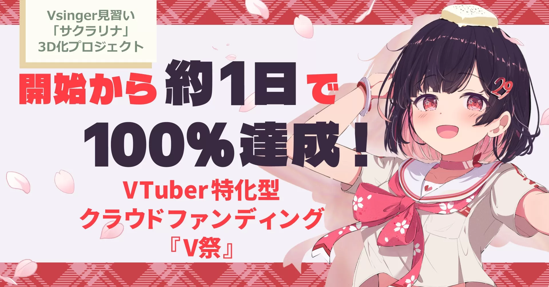 2D・3DCGの映像制作を手がけるデジタルギア株式会社(本社:東京都港区、代表取締役:漆崎祥一)が運営する、VTuber特化型クラウドファンディングプラットフォーム『V祭(ぶいさい)』(https://v-sai.com/)において、Vsinger見習い「サクラリナ」さんによる3D化プロジェクトが、2025年11月25日19時の開始から約1日(約27時間)で目標金額220万円を達成しました。