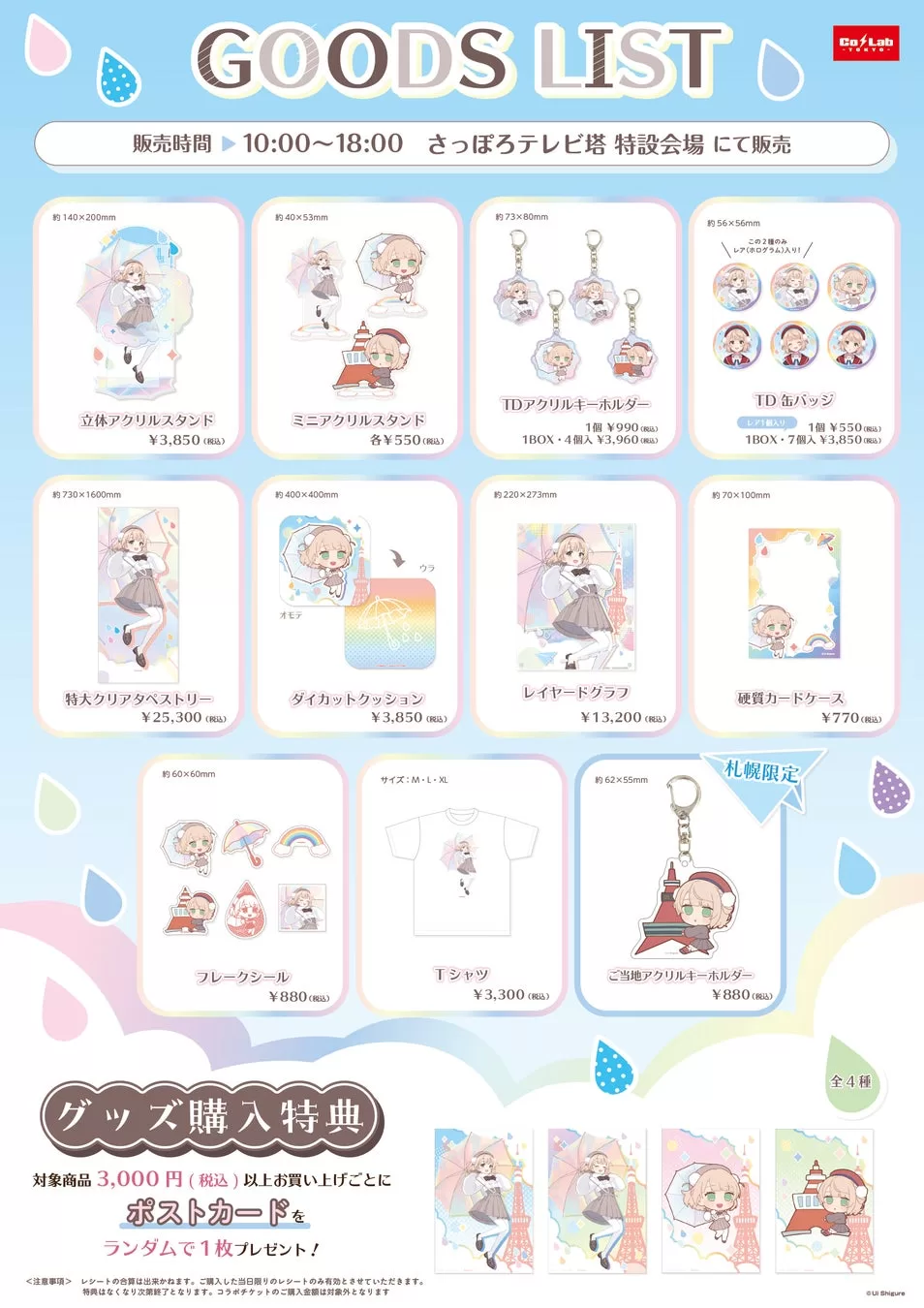さっぽろテレビ塔特設会場では、本イベントの為に描き下ろしたイラスト等を使用したコラボグッズを販売いたします。札幌会場限定【ご当地アクリルキーホルダー】も登場。開催期間中は1会計3,000円(税込)ご購入毎に、描き下ろしイラスト&描き起こしミニキャラの【特典ポストカード】全4種をランダムで1枚プレゼントいたします。