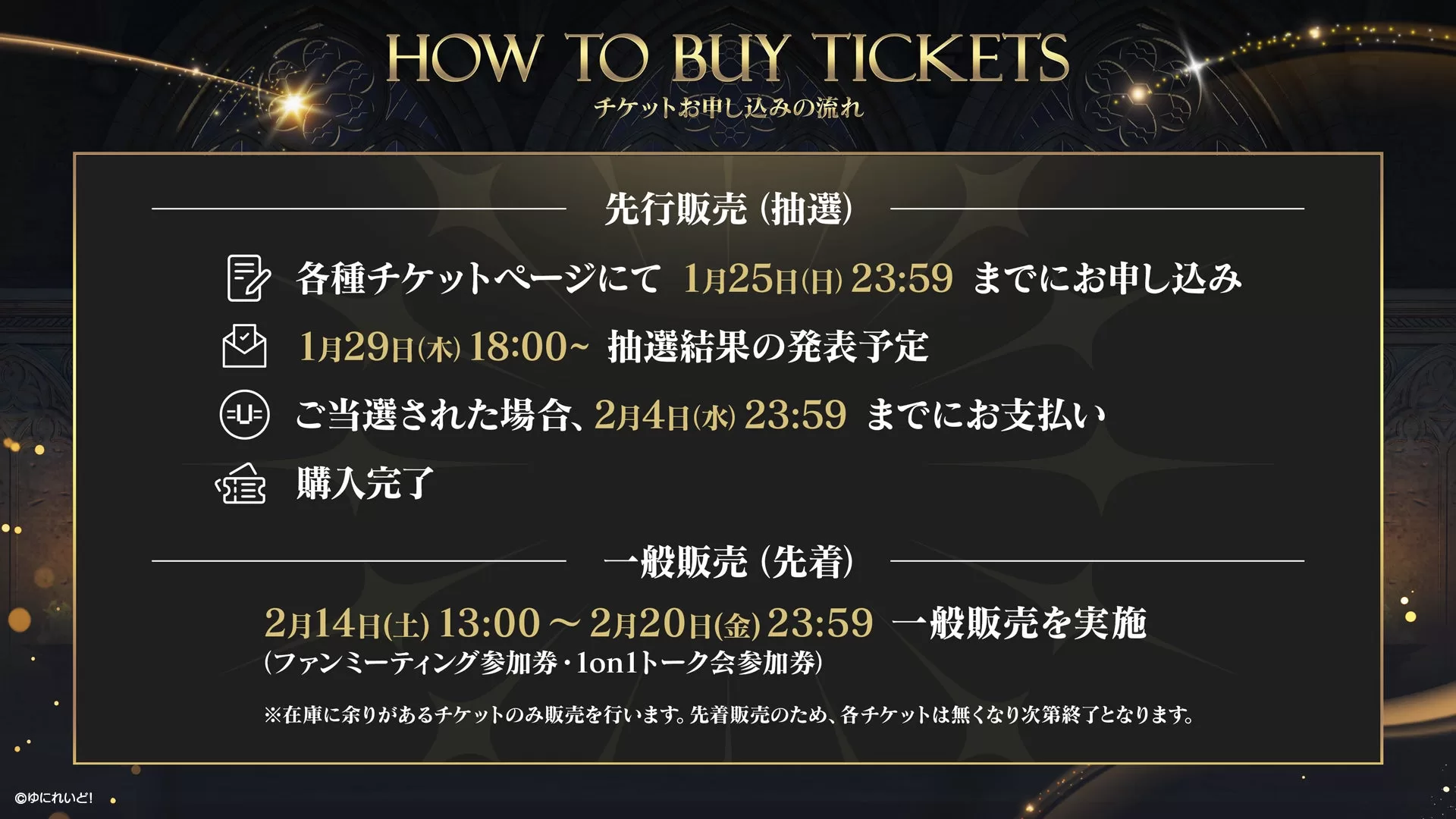 ※物販会場は参加券不要で入場可能ですが、混雑緩和のため、整理券やファンミーティング参加者向けの優先レーンの導入を検討しております。詳細はゆにれいど!公式Xをご確認ください。【券種一覧】