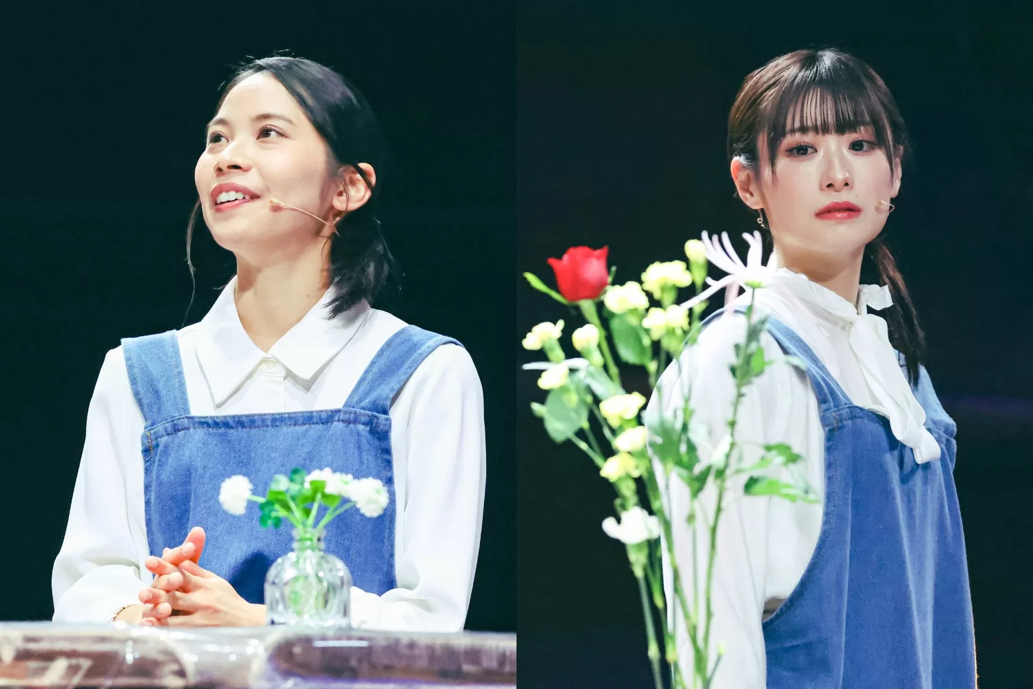 左から)白椿 紅役:唯月ふうか、白椿 蒼役:屋比久知奈 舞台は花屋のバックヤード。世界で400店舗を展開するパリのお花屋さんをテーマとしたフラワーショップ「MONCEAU FLEURS」とのコラボレーションによって、お花屋さんの世界観を彩る舞台美術がリアリティを持って実現した。