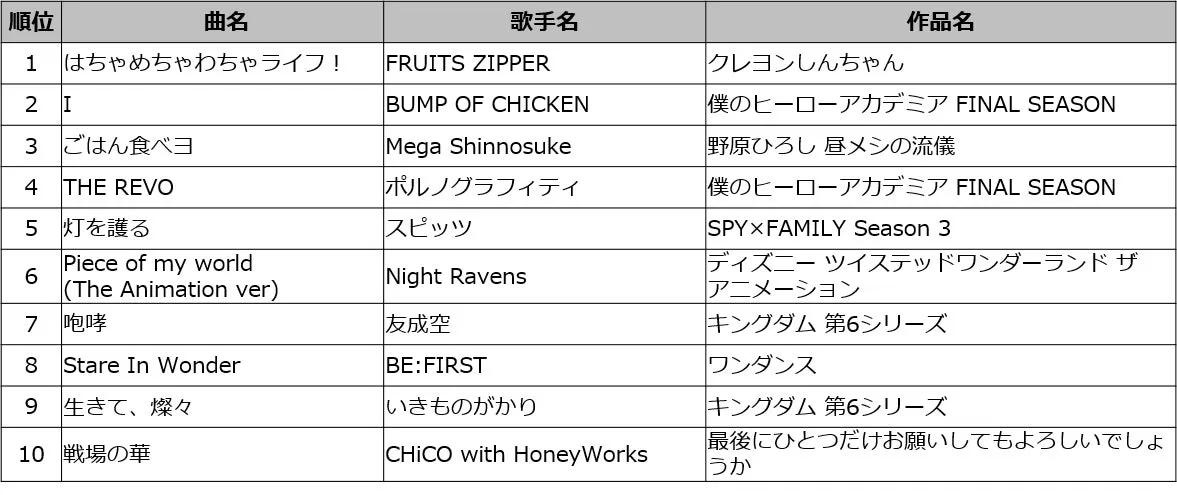1位はFRUITS ZIPPERの「はちゃめちゃわちゃライフ!」(『クレヨンしんちゃん』関連)で、NHK紅白歌合戦初出場を果たした曲。3位にはMega Shinnosuke「ごはん食べヨ」(『野原ひろし 昼メシの流儀』OP)がランクイン。2位はBUMP OF CHICKEN(『僕のヒーローアカデミア FINAL SEASON』OP)、4位ポルノグラフィティ(ED)、5位スピッツ「灯を護る」(『SPY×FAMILY Season 3』OP)などジャンプ系アニメが強さを発揮した。