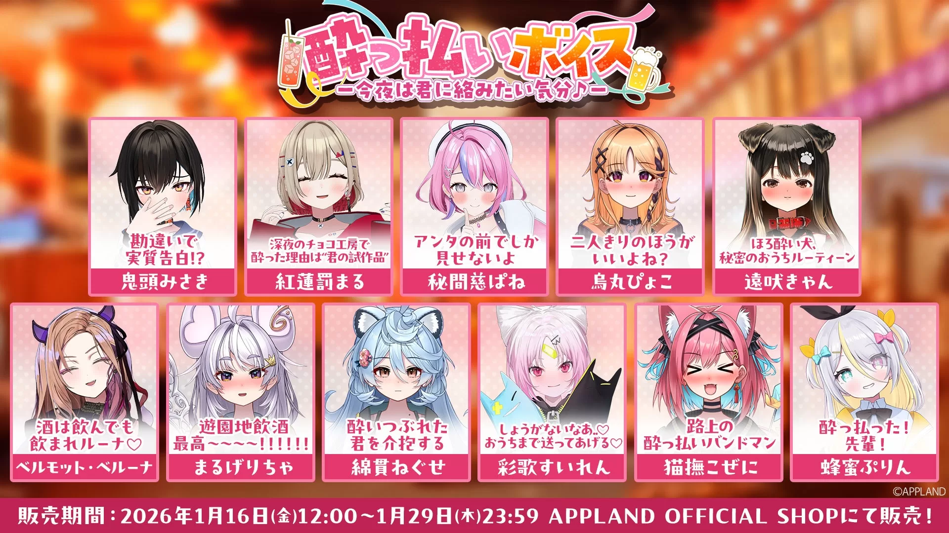 株式会社アップランドが運営する「.LIVE」および「ぶいぱい」メンバーのボイスコンテンツ『酔っ払いボイス -今夜は君に絡みたい気分♪-』が、APPLAND OFFICIAL SHOPにて2026年1月16日(金)12時から販売開始される予定です。