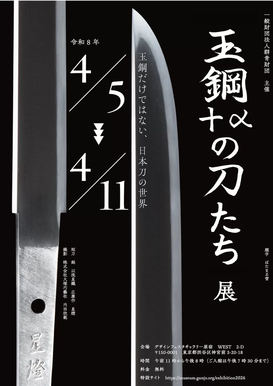 一般財団法人群青財団(事務所:大阪府高槻市、理事長:堀江仁貴)は、令和8年4月5日から同月11日までの期間、東京・原宿にあるデザインフェスタギャラリー原宿にて、令和8年度春季企画展〈玉鋼+αの刀たち〉を開催いたします。