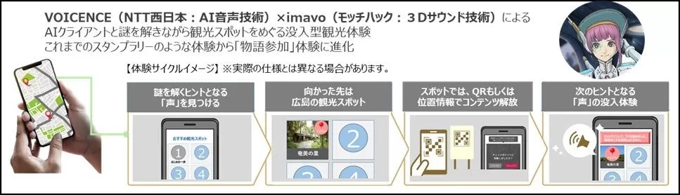 本イベントは、NTT西日本が音声AI事業「VOICENCE」を活用して企画をプロデュース。人気声優でバーチャルYouTuber・キズナアイのボイスモデルを務める春日望のAI音声を制作する。また、株式会社モッチハックが独自のイマーシブ3Dサウンド「imavo™」を提供し、スマートフォンとイヤホンだけで没入感あふれる謎解き観光を実現する。日本語・英語対応で、国内外の観光客が物語に没入しながら広島のスポットを周遊できるとのこと。