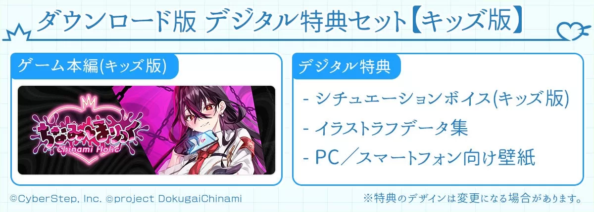 本作は、VTuber「毒ヶ衣ちなみ」さんが本人役かつ主役を務め、全編フルボイスでお楽しみいただけるだけでなく、12歳からお楽しみいただける【キッズ版】と、ちょっと内容が刺激的な17歳からお楽しみいただける【ご褒美版】の2つのバージョンを用意しています。