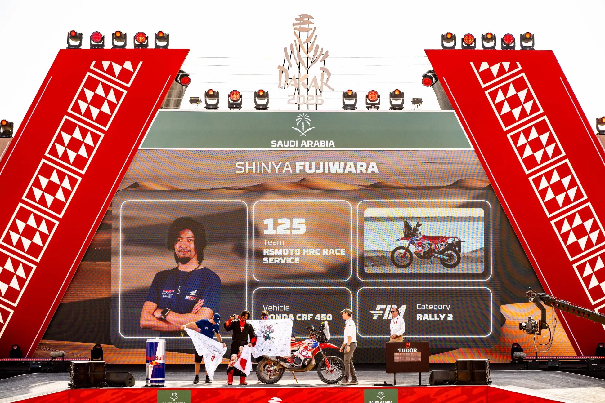 今大会で48回目を数える「ダカール・ラリー」は、2026年1月3日から17日まで、サウジアラビアで開催されました。3ヶ年計画で参戦権を獲得し、夢の「ダカール・ラリー」のスタート地点に立った藤原は、初日から果敢に難コースに挑みました。しかし、転倒によりステージ2で目の周りを、ステージ5では鎖骨を骨折。複視や骨折による激痛に見舞われながらも、15日間 7,983kmを見事走り切りました(二輪部門 総合55位、RALLY2クラス 44位)。