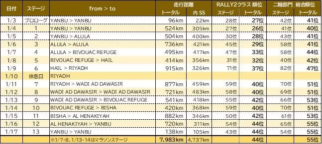 ■ 藤原慎也選手からのコメント このたび、3ヶ年計画で目指してきた2026年ダカール・ラリーにおいて、無事ゴールポディウムに立ち完走者になることができました。スタートから15日間、総走行距離7,983km。そのうち、目の周りと鎖骨の骨折を抱えた状態で走行した距離は5,214kmに及びました。