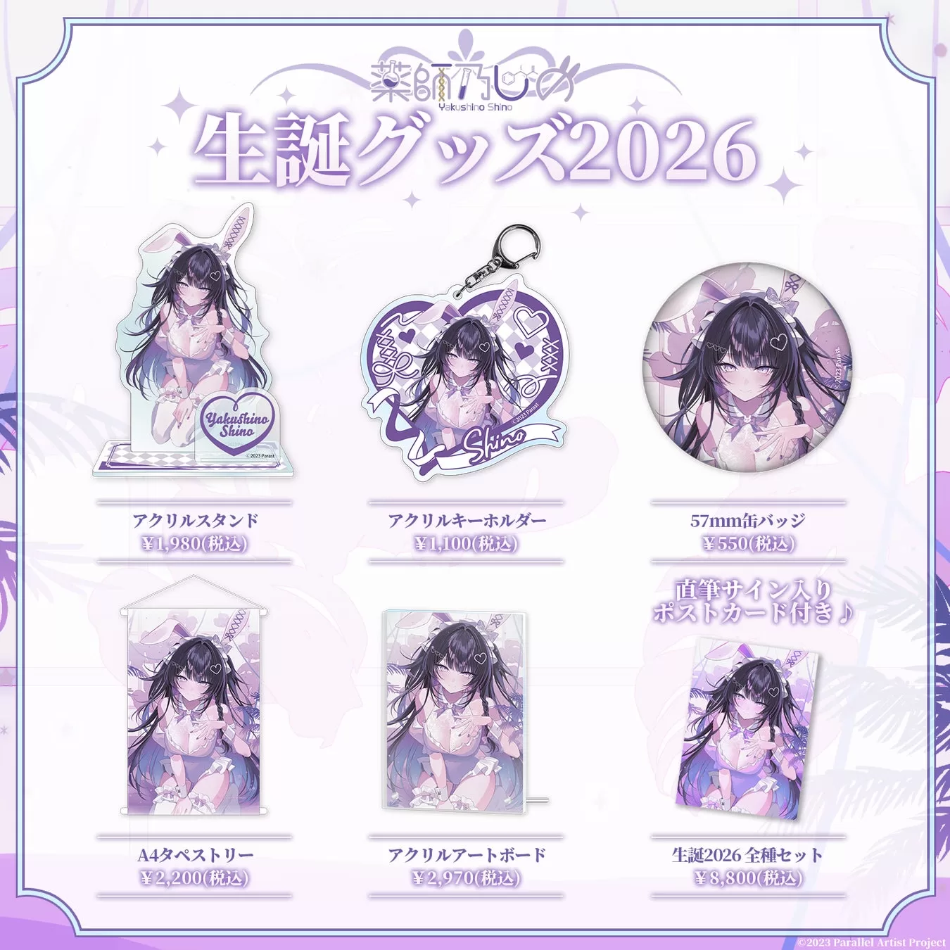 グッズラインナップは全種セット(8,800円税込)、アクリルスタンド(1,980円税込)、缶バッジ(550円税込)、アクリルキーホルダー(1,100円税込)、A4タペストリー(2,200円税込)、アクリルアートボード(2,970円税込)。発送は2026年5月初旬以降順次予定されている。