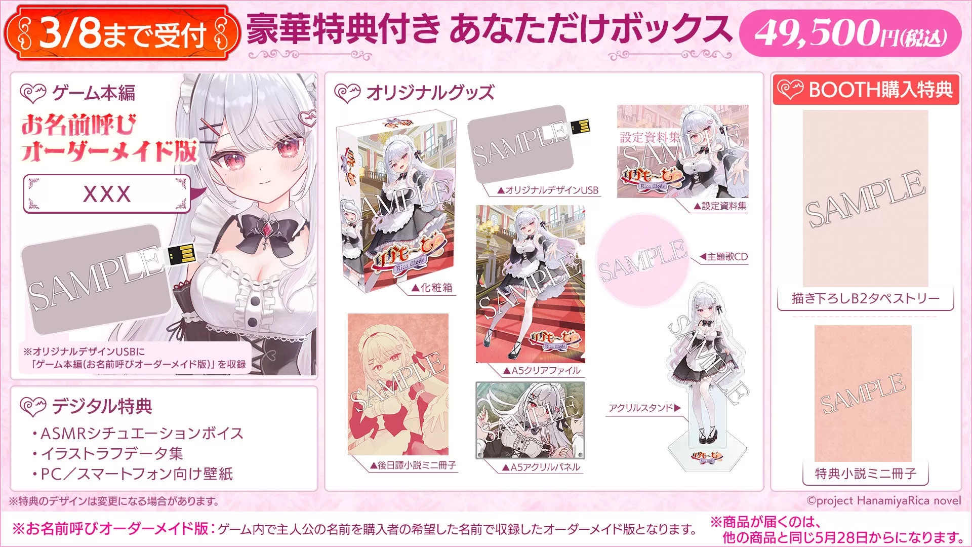 本商品は、購入者名を呼ぶゲーム本編お名前呼びオーダーメイド版とグッズを同梱。化粧箱内容にはオリジナルデザインUSB(ゲーム本編収録)、設定資料集、後日譚小説ミニ冊子、A5クリアファイル、アクリルスタンド、主題歌CD、デジタル特典(ASMRシチュエーションボイス、イラストラフデータ集、壁紙)などが含まれる。BOOTH購入特典として描き下ろしB2タペストリーと特典小説ミニ冊子が付く。追加受付分は2026年5月28日(木)配送予定。