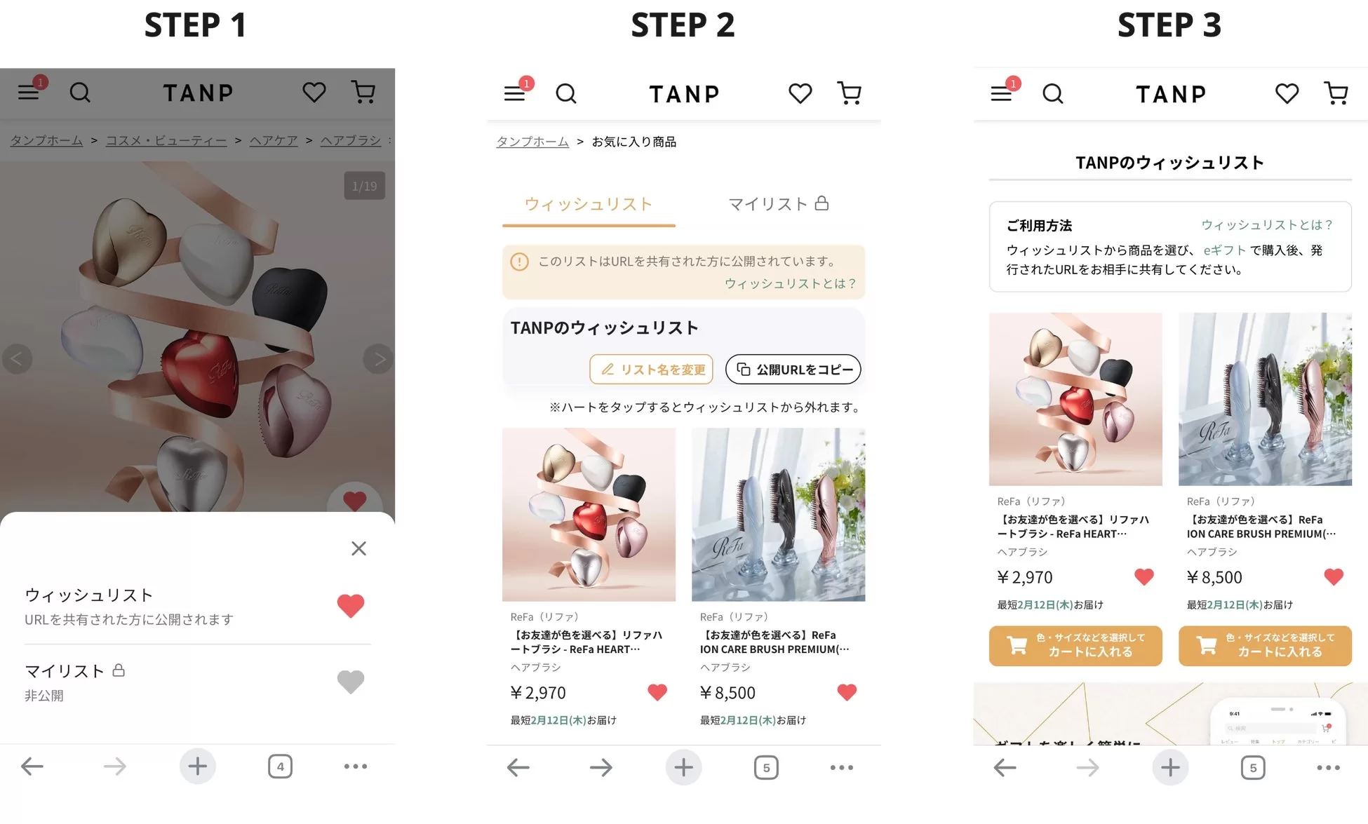 利用流れは3ステップ。STEP1で商品ページの「♡(お気に入り)」からウィッシュリストへ追加。STEP2でマイページからリスト名を設定し共有URLをコピーしてシェア。STEP3で贈り手がURLから商品を選びeギフトで購入する。