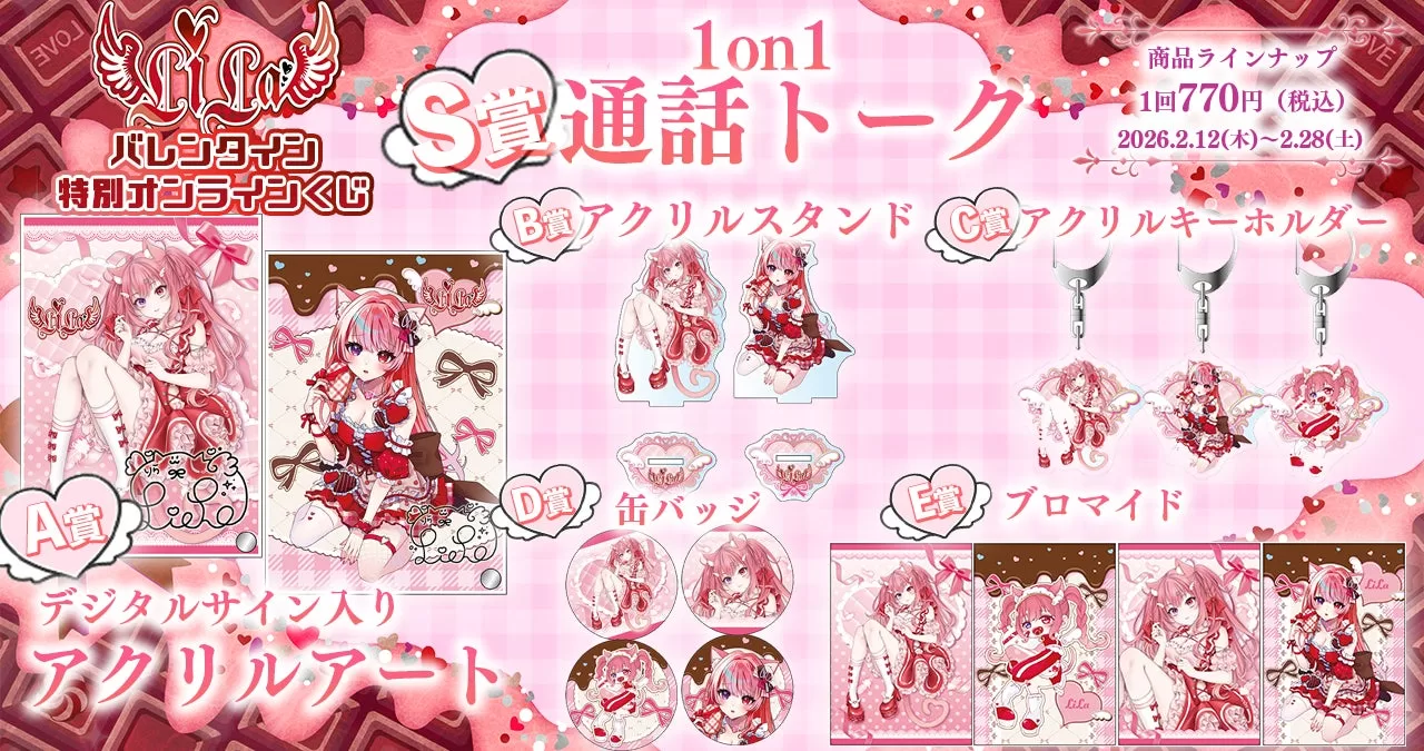 株式会社CHET Groupは、オンラインくじサービス「CHETスクラッチ」にて、VライバーLiLaのオリジナルグッズが当たる『LiLa2026バレンタイン特別オンラインくじ』を本日2026年2月12日(木)18:00より販売開始すると発表した。