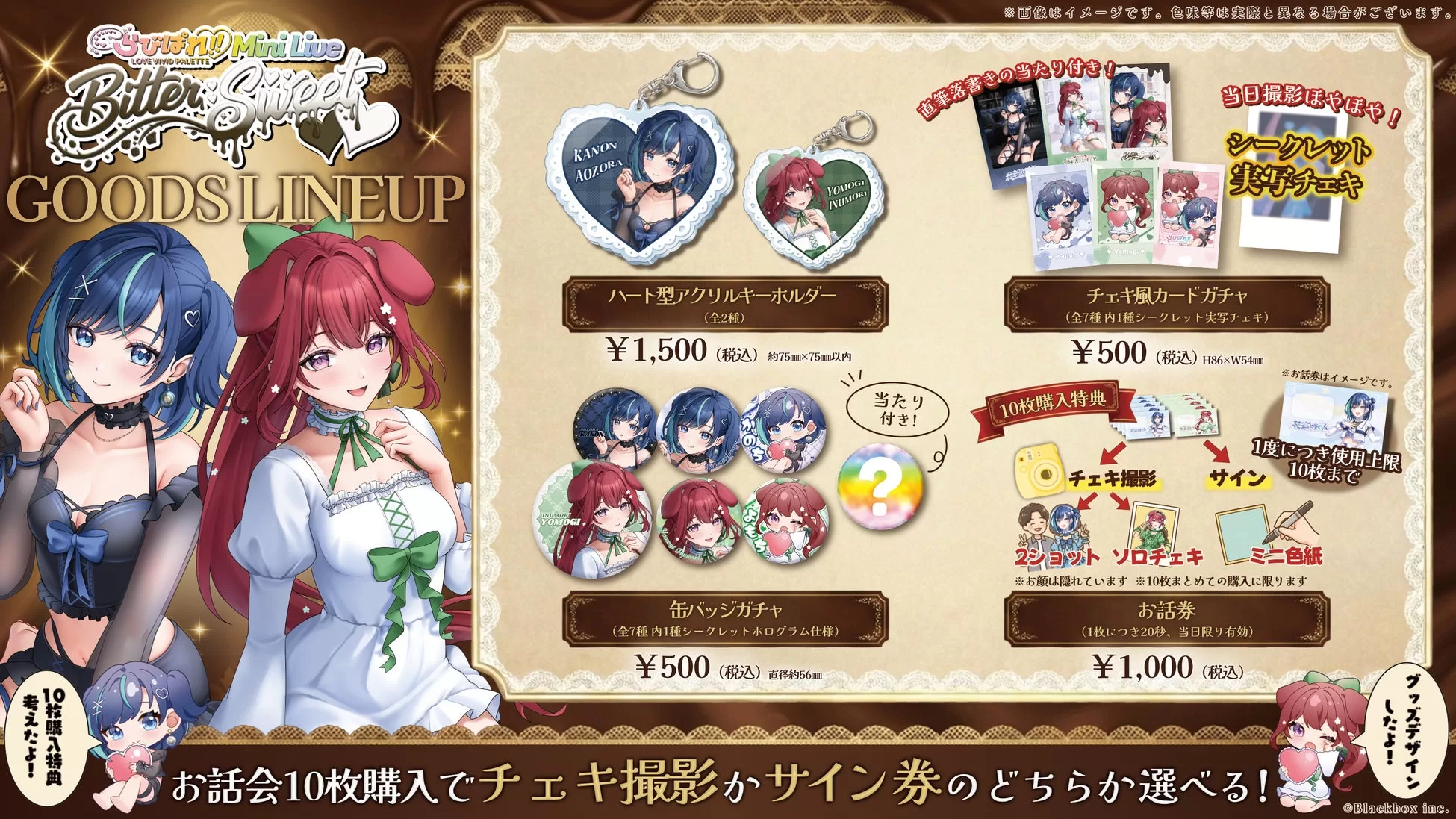 ハート型アクリルキーホルダー(全2種:葵空かのん/狗森よもぎ、各1,500円税込、サイズ約75mm×75mm以内) チェキ風カードガチャ(全7種+シークレット実写チェキ、500円税込、H86×W54mm、直筆落書き当たり付き) 缶バッジガチャ(全7種+1種シークレットホログラム、500円税込、直径56mm) お話し券(1,000円税込、ライブ後のお話し会用。10枚ご購入ごとにチェキ撮影orミニ色紙プレゼント) お支払いは現金、クレジットカード、交通系IC、QUICPay対応。