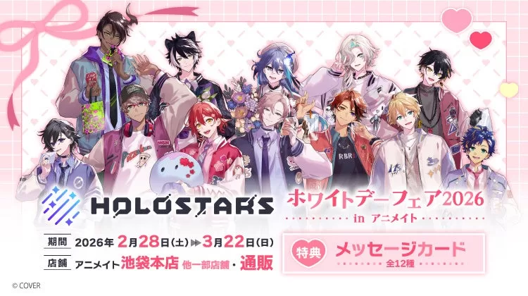 株式会社アニメイトは、男性VTuberグループ「ホロスターズ」の新商品を2026年2月28日から販売いたします。また、同日より『HOLOSTARS ホワイトデーフェア2026 in アニメイト』を開催いたします。