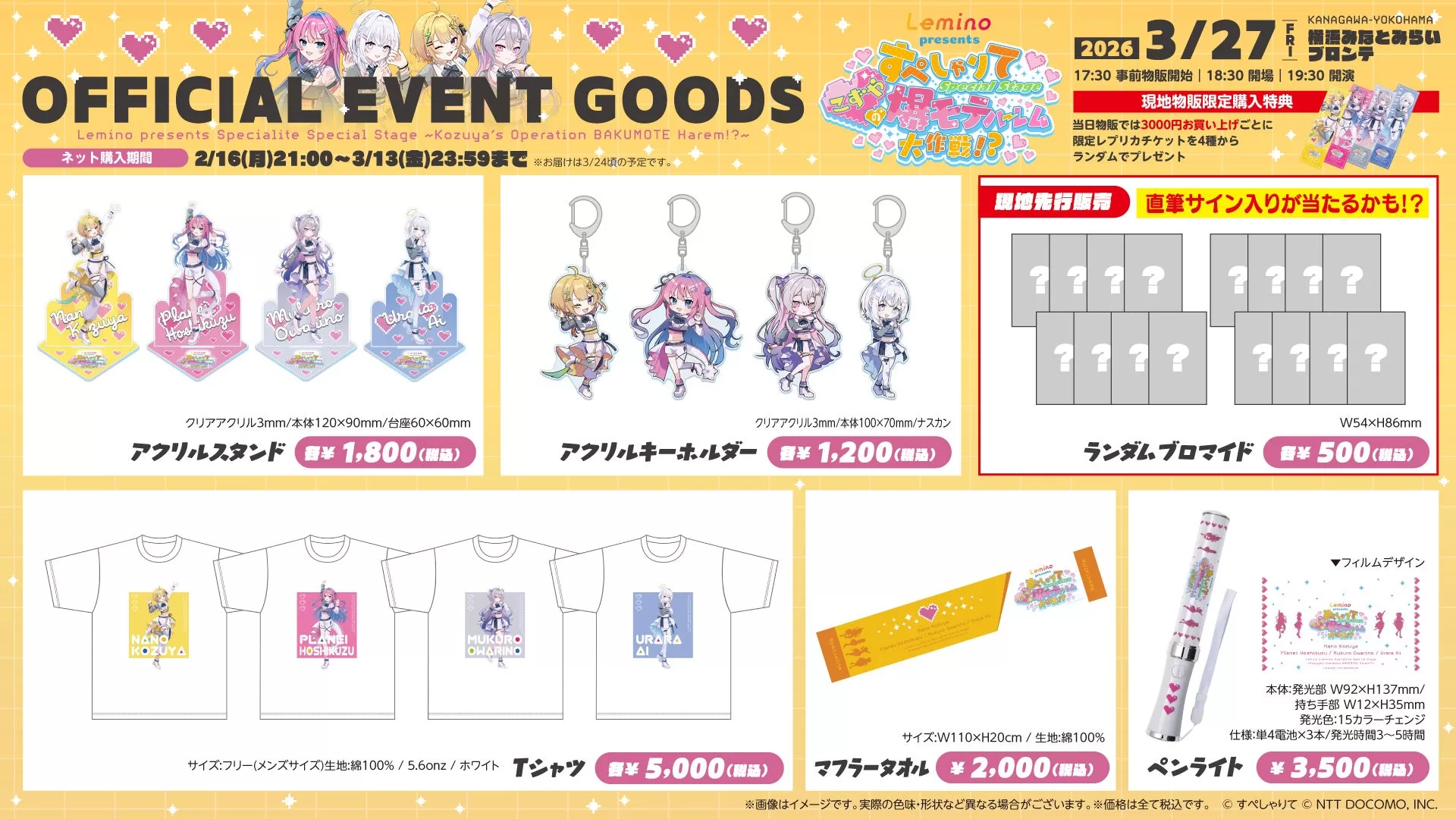 本ライブの開催を記念し、本公演限定のオリジナルグッズの販売が決定しました。ペンライト、Tシャツ、タオル、アクリルスタンド、アクリルキーホルダーなど、ここでしか手に入らない特別なラインナップをご用意しています。