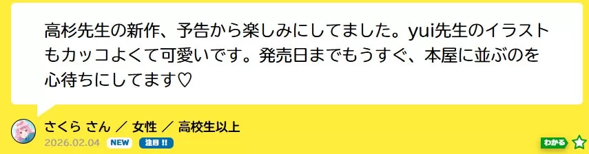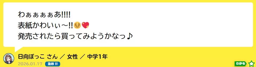 発売前からキミノベルHPに期待の声が寄せられている。高杉六花は北海道恵庭市在住で、こども発達学修士。主な著書に『ないしょの未来日記』『桧山先輩はわたしの〇〇!』(ポプラキミノベル)など。公式HPはhttps://www.takasugirikka.com/。イラストのyuiは旅行・ゲーム・犬好きで、『パーフェクト・セキュリティ』(角川つばさ文庫)などを担当。