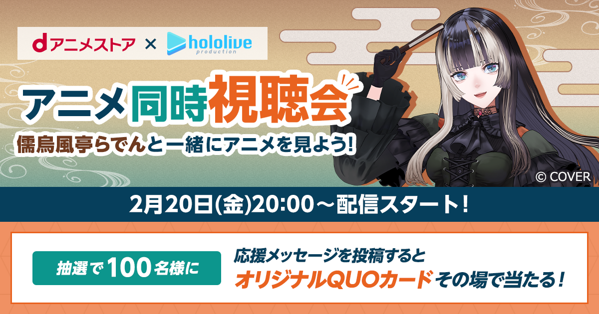 また、同時視聴会記念キャンペーンとして、2026年2月19日(木)から2月25日(水)まで「dアニメストア」公式Xで実施。公式Xをフォローし、ハッシュタグ「#儒烏風亭らでんとdアニメストア」を付けて応援メッセージを投稿した人の中から抽選で100名にオリジナルQUOカード500円分をプレゼントする予定だ。詳細は公式Xのキャンペーンポストを参照。