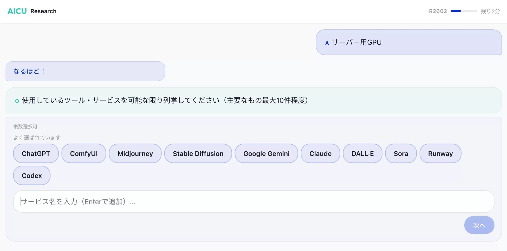 生成AI時代の”つくる人”調査(R2602)を開始しました。 チャットで答える新感覚アンケート! 約3分で完了&10,000ポイントもらえます。 https://p.aicu.jp/R2602 #AICU #生成AIつくる人調査