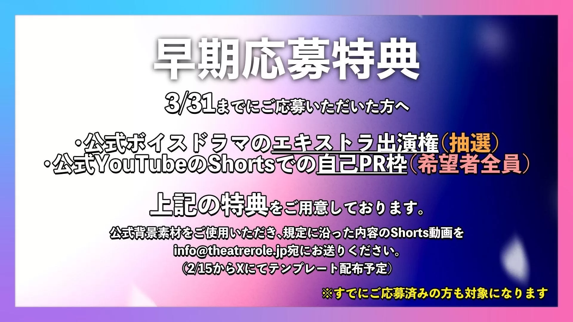 • 早期応募特典(3月31日まで):公式ボイスドラマエキストラ(抽選)、YouTube Shorts自己PR(希望者全員)