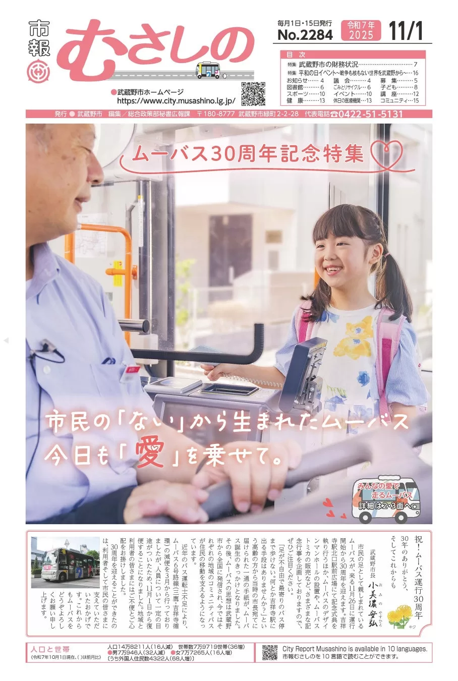 1~3面の特集は、令和7年11月26日に運行30周年を迎えたコミュニティバス・ムーバス。日頃からムーバスを利用する市内在住の小学生と、ムーバス運転士をモデルとした写真で、「愛」をテーマとしてムーバスの成り立ちや未来を紹介した。