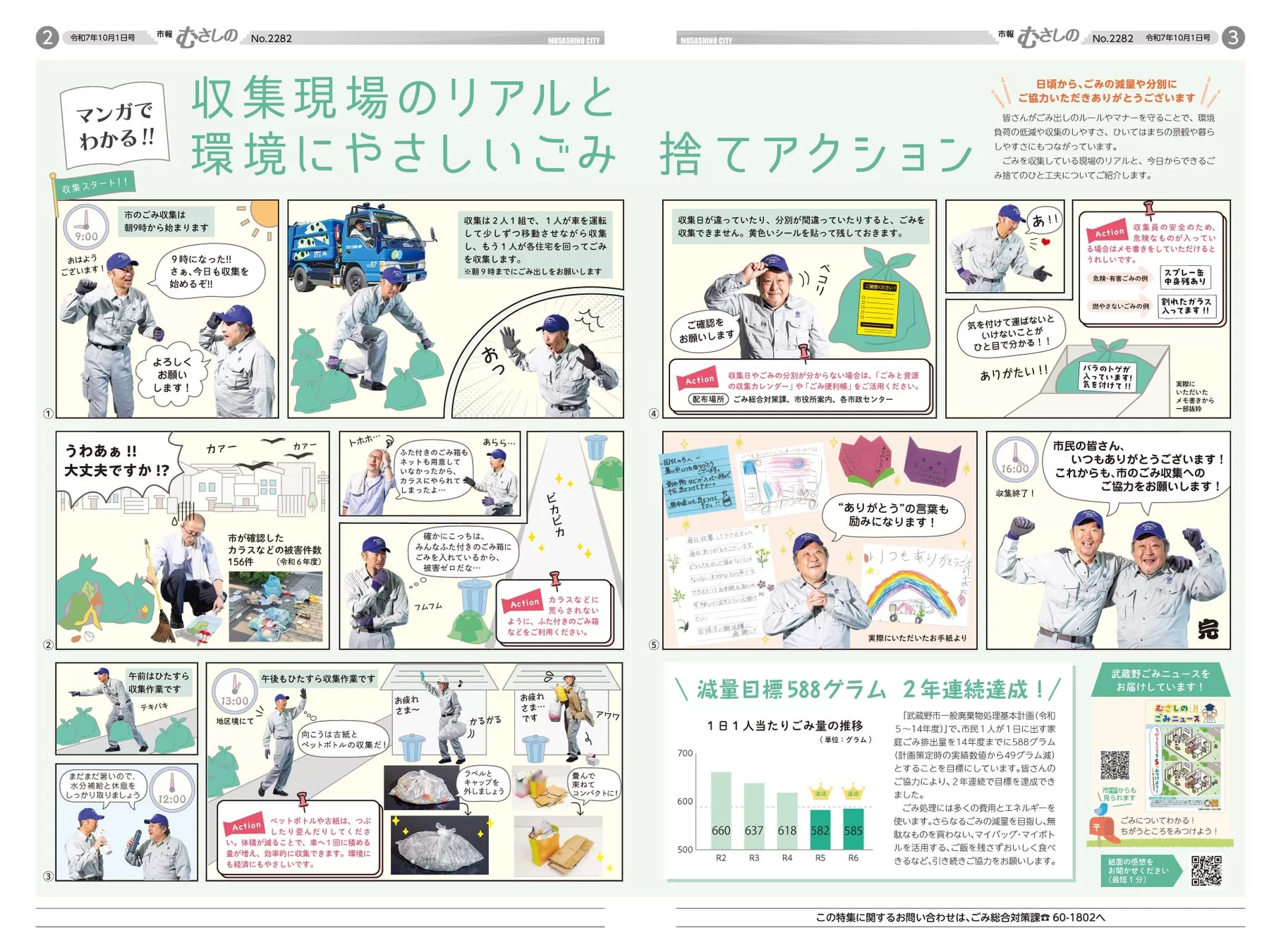 市報むさしの令和7年10月1日号 2,3面 1~3面の特集記事は「ごみは捨ててからがスタート」をテーマとした「マンガでわかる‼収集現場のリアルと環境にやさしいごみ捨てアクション」。ごみ収集員の1日を漫画形式で取り上げつつ、ごみ捨てのポイントを紹介した。
