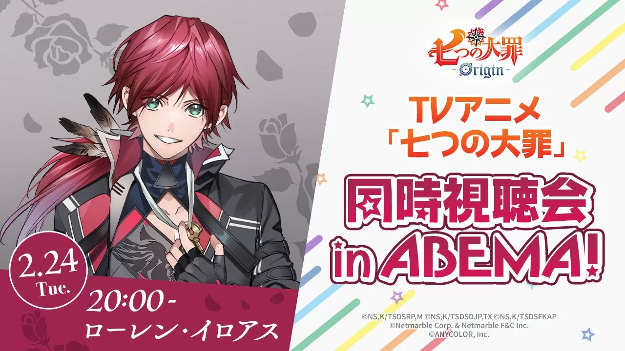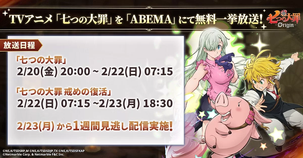 ネットマーブルは、現在事前登録受付中の新作アニメーションオープンワールドRPG『七つの大罪:Origin』(開発:Netmarble F&C Inc.)において、本日2月20日(金)より、新しい未来のテレビ「ABEMA」にてTVアニメ『七つの大罪』シリーズの無料一挙放送が決定いたしました。