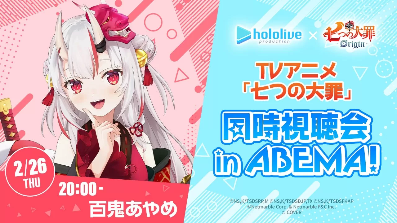 人気VTuberグループ「ホロライブ」所属の「百鬼あやめ」さんと一緒に、「ABEMA」で無料一挙放送するTVアニメ「七つの大罪」を楽しむ同時視聴会を開催いたします。