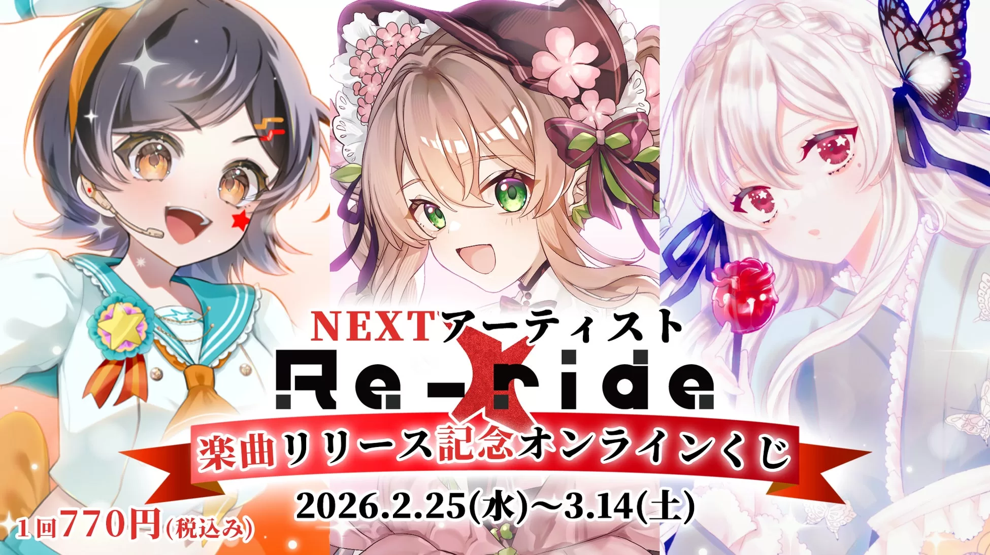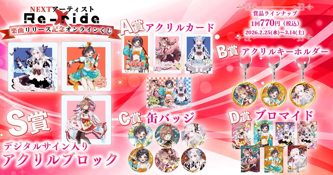 株式会社CHET Group(本社:東京都品川区、代表取締役CEO:小池祐輔)は、オンラインくじサービス「CHETスクラッチ」にて、VTuber一ノ宮満月、はなごろも、LOCOのオリジナルグッズが必ず当たる『NEXTアーティスト Re-ride楽曲リリース記念オンラインくじ』を、2026年2月25日(水)18:00より販売開始すると発表した。