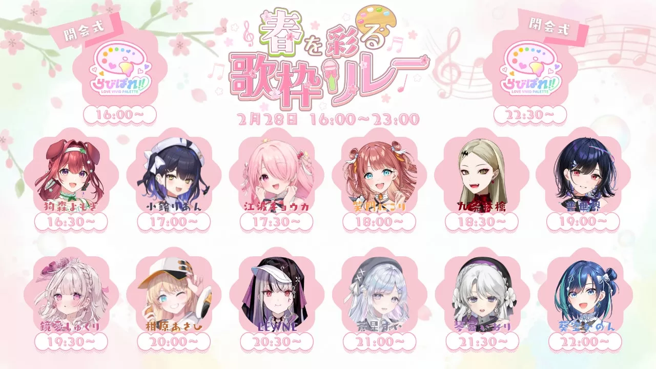 イベントは各出演者のYouTubeチャンネルで配信され、公式再生リストはこちら。公式ハッシュタグ「#春を彩る歌枠リレー」の使用でトレンド入りを目指すとのこと。