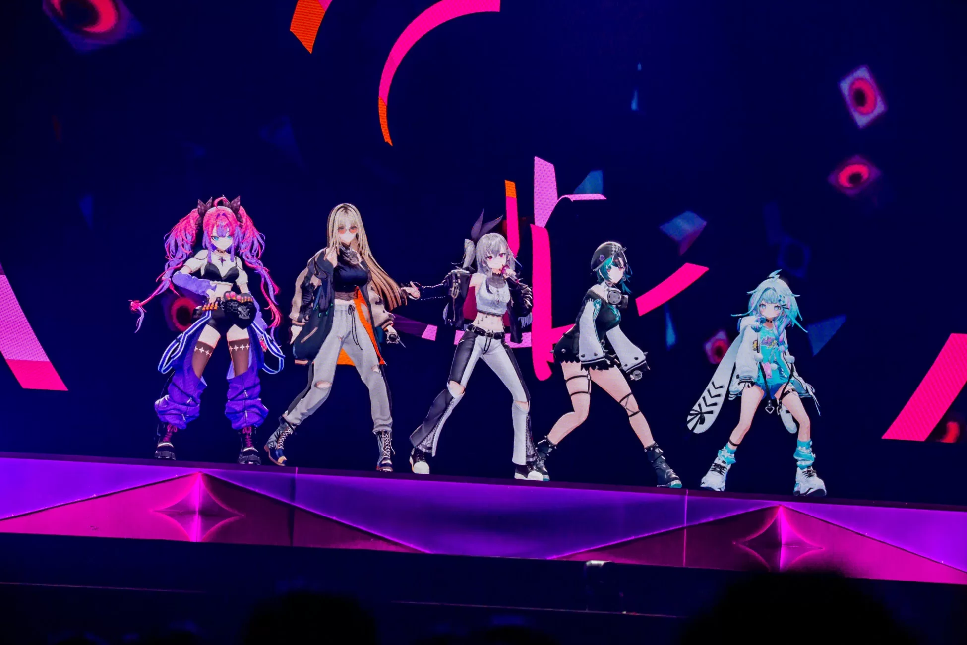 2組目は「hololive DEV_IS」所属の「FLOW GLOW」の5名。2024年11月にデビューした彼女らは、先日の3Dライブでお披露目した「MAKE IT, BREAK IT」を引っ提げてきた。歌とラップを持ち味に掲げる彼女らだが、ダンスを得意とするメンバーも多く、ハマればハマるほどそのポテンシャルの高さに惚れ惚れさせられるユニットだ。かと思えばMCはおふざけあり、じゃれ合いありの和やかな雰囲気に。