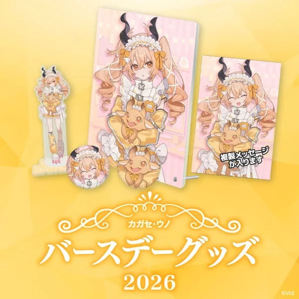 株式会社ソニー・ミュージックエンタテインメントは、バーチャルタレント育成&マネジメントプロジェクト「VEE」の公式オンラインショップ「VEE Official Shop 」にて、所属バーチャルタレントカガセ・ウノの2026バースデーグッズの受注販売を開始したとのこと。