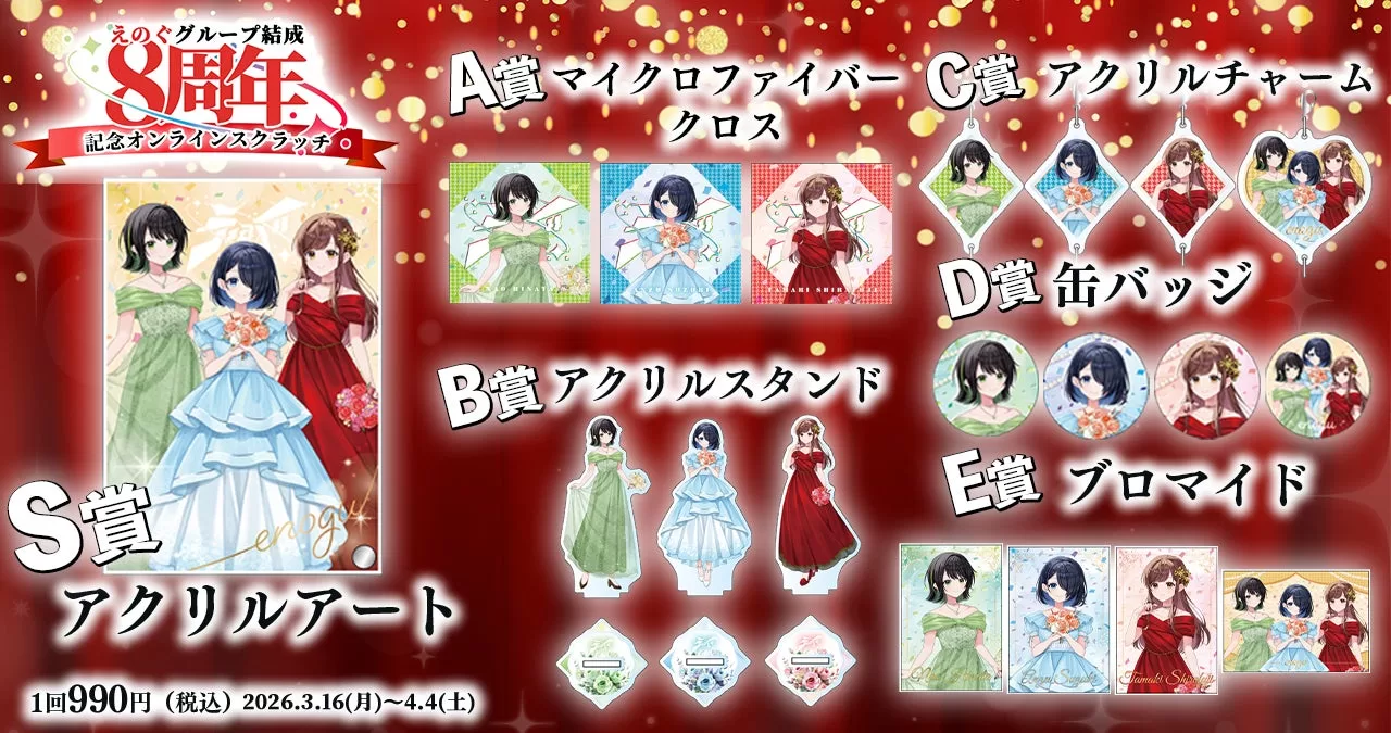 株式会社CHET Groupは、オンラインくじサービス「CHETスクラッチ」にて、VRアイドルグループえのぐのグループ結成8周年を記念した『えのぐ グループ結成8周年記念スクラッチ』の販売を、2026年3月16日(月)18:00より開始すると発表した。販売期間は同年4月4日(土)23:59までで、1回990円(税込)。