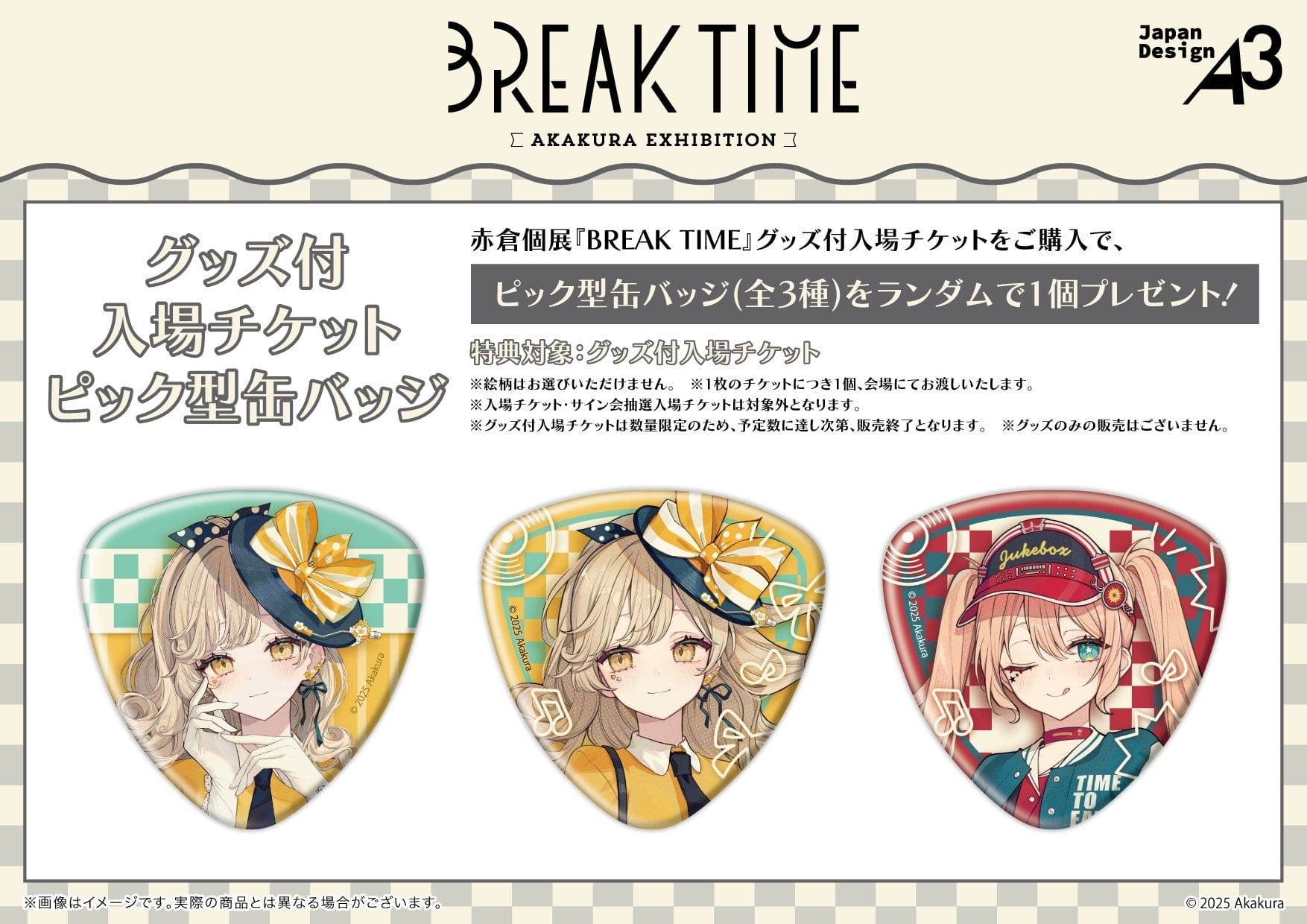 赤倉個展『BREAK TIME』グッズ付入場チケットをご購入で、ピック型缶バッジ(全3種)をランダムで1個プレゼント!
